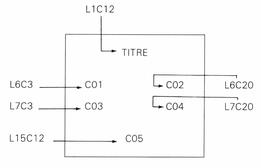 Appelons A$ la chaîne de caractères qui représentera l'écran. Cette chaîne aura la structure suivante : A$ = SPACE$(12) + "TITRE" + CHR$(13) + CHR$(13) + CHR$(13) + CHR$(13) + CHR$(13) A$ = A$ + SPACE$(3) + "C01 " + etc.L'ordre « PRINT A$ » affichera l'écran que l'on vient de définir. |