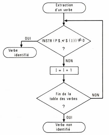 Les verbes sont définis dans un dictionnaire de verbes qui rassemble tous les verbes « compréhensibles » par la machine. Soit V$ ce dictionnaire. De même pour les sujets. Soit S$ le dictionnaire des sujets. Nous appellerons v$ un élément de V$, et s$ un élément de S$. Soit enfin une phrase P$ entrée par le joueur. L'extraction des verbe et sujet de P$ se fera de la manière suivante : (voir organigramme p. 33). De même pour les sujets. |