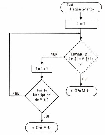 | Utilisation | Vous voulez mettre une majuscule sur la première lettre d'un mot. Soit un mot « MOT$ » qui représente un nom propre, et prend donc une majuscule. Si ce mot a été entré par l'opérateur, il peut automatiquement prendre une majuscule de la façon suivante :1000 A = ASC(MOT$) 1010 IF A> 96 THEN MOT$ = CHR$(A-32) + RIGHT$(MOT$, LEN(MOT $) - 1 ) 2000 PRINT MOT $A>96 indique que la lettre est une minuscule, CHR$(A-32) transforme une minuscule en majuscule, RIGHT$(MOT$, LEN(M0T$)- 1 ) est égal à MOT$, la première lettre exclue.De même, on peut imaginer dans un traitement de textes une telle option qui met automatiquement des majuscules après les points, les supprime après les points-virgules, les virgules, ou met un blanc après les virgules, points-virgules et points. Analyse du problème : Le fichier texte étant stocké en mémoire sous forme ASCII, il suffit de le décrire du début à la fin en recherchant les caractères point, virgule et point-virgule. Ce qui se traduit par l'organigramme suivant :