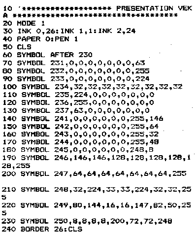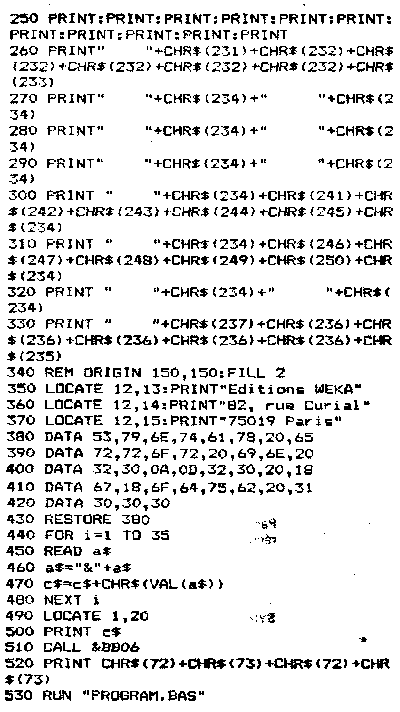 4/0 - Langages du CPC4/1.6 - Basic approfondi 4/1.6.1 - SYMBOL et SYMBOL AFTER Votre Logo personnalisé – Aller plus loin avec la redéfinition des caractères Rappels et compléments Nous allons dans ce chapitre, créer un petit programme affichant un logo au nom des Editions Weka, et que vous pourrez modifier afin de le personnaliser. Ce logo permettra d'étudier la fonction SYMBOL ainsi que SYMBOL AFTER, et d'en cerner un peu les restrictions d'utilisation. Avant toute définition de caractères, il est souhaitable de le signaler au Basic par l'instruction SYMBOL AFTER n. Cette fonction indique au Basic que des caractères dont le numéro commence en n + 1 vont être redéfinis. Après cette déclaration, vous pourrez redéfinir vos caractères par la commande SYMBOL N° de caractère (le petit programme de la Partie 5, chapitre 9 page 2 vous y aidera). Chaque caractère ainsi défini est accessible par la commande : PRINT CHR$(N° de caractère) Vous pourrez même les associer dans une chaîne de caractères, par exemple : A$ = CHR$(N°1) + CHR$(N°2) + ... etc ... Il est même possible d'y associer des caractères de contrôle permettant un affichage sur plusieurs lignes (les caractères CHR$(8) = retour d'un caractère ; CHR$(9) = avance d'un caractère ; CHR${11) = remonte d'une ligne sur la même colonne). Essayez par exemple, en utilisant les caractères prédéfinis dans le moniteur (c'est-à-dire en ne vous préoccupant pas encore de redéfinir un caractère – voir Annexe 3 pages 1 à 12) :