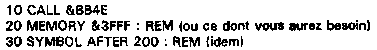 – Ligne 60 : réservation de redéfinition pour les carctères à partir de 231. FOR i = 1 to 3000 : next i Nous espérons que votre curiosité et votre perspicacité vous inciteront à étudier ce programme et à le modifier pour créer votre propre logo. Les restrictions d'utilisation RÉCUPÉRATION DE MÉMOIRE Sans que vous le sachiez, le CPC effectue, lors de la mise sous tension, ou d'une réinitialisation, la réservation de la place mémoire pour 16 caractères redéfinissables. Par contre, si vous ne redéfinissez aucun caractère, il est possible de récupérer cette place mémoire (un caractère occupant 8 octets, on peut récupérer : 8 x 16 = 128 octets), grâce à la commande SYMBOL AFTER 256. SYMBOL AFTER ET MEMORY ; f- La commande SYMBOL AFTER est réputée pour faire très mauvais ménage avec l'instruction MEMORY. Essayez donc : MEMORY &9FFF et vous voilà face à un message d'erreur vous signalant : IMPROPER ARGUMENT alors que tout semble correct. Cela est très fâcheux lorsque vous désirez implanter des routines en langage machine et que vous désirez les protéger. Un premier remède qui semble fonctionner est d'inverser ces deux instructions. Mais ici aussi il y a un problème : si vous avez placé ces deux instructions dans un programme, dans cet ordre : 10 SYMBOL AFTER 200 et que vous en êtes encore aux essais de votre programme, tout se passe correctement au premier « RUN », mais de nouveau le message d'erreur précédent s'affiche au deuxième « RUN ». Cette routine effectue une réinitialisation complète de l'écan, des variables texte, des indirections de l'écran, de la table de contrôle, mais, ce qui nous intéresse avant tout : la table des caractères redéfinis est réinitialisée. Après tant de réinitialisation, on comprendra que l'appel de TXT-INITIALISE doit être la première instruction du programme. L'expérience indique que placer l'instruction SYMBOL AFTER avant la réservation mémoire provoque, lors de l'exécution de cette dernière un assez désagréable message d'erreur MEMORY FULL. On retiendra donc la séquence d'instructions suivante qui résoud les problèmes de redéfinition de caractères :