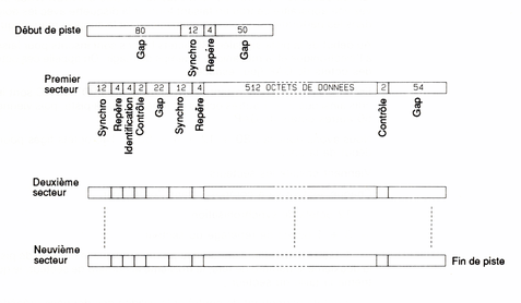 - 4 octets d'identification, dont le premier indique le numéro de piste, le deuxième le numéro de tête, le troisième le numéro de secteur, le quatrième la taille du secteur ;