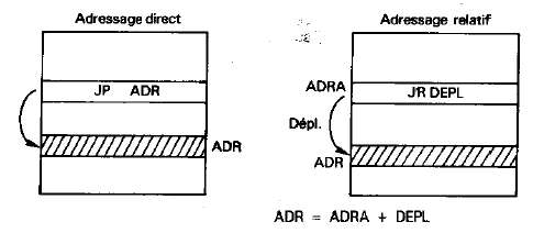* Adressage relatif Concerne les instructions de saut du type JR. Quand l'adresse à laquelle doit s'effectuer le débranchement est assez proche (entre + 127 et - 128 octets) de l'adresse courante, ces instructions peuvent être employées pour « économiser » un octet en codage. En effet, une instruction JP est codée sur 3 octets, alors que l'instruction JR équivalente est codée sur 2 octets.