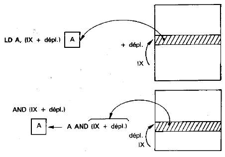 Remarque : L'utilisation d'un ordre JR pour accéder à un label situé hors des limites permises (entre (+127 et -128 octets) produira une erreur lors de l'assemblage du programme. * Adressage indirect indexé Accès à une information d'adresse IX + déplacement ou IY+déplacement de la forme LD A, (IX + depl) ou AND (IX + depl)