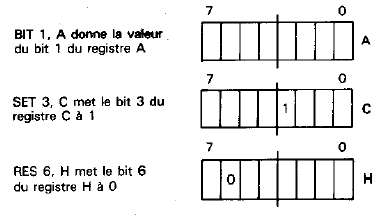 * Adressage bit Positionnement ou test d'un bit : Les instructions « BIT » testent un bit, les instructions « SET » mettent un bit à 1, et les instructions « RES » mettent un bit à 0.