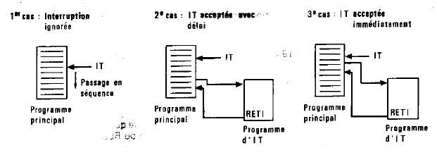 Dans le deuxième et le troisième cas, vous reprendrez sans doute la lecture du livre quand la conversation téléphonique sera finie.Dans un ordinateur, les interruptions sont interprétées par le microprocesseur de la même manière que la sonnerie du téléphone dans l'exemple ci-dessus, et la lecture du livre correspond à l'exécution d'un programme. Si le programme est ininterruptible (cas N° 1 de notre exemple), l'interruption ne sera pas prise en compte et le programme continuera son exécution sans aucun arrêt. Si le programme est interruptible, selon la priorité de l'interruption, il sera interrompu immédiatement (cas n° 3 de notre exemple), ou après un certain temps (cas n° 2 de notre exemple) – Voir page suivante –. - Nous savons ce qu'est une interruption, mais pas encore ce qui peut la provoquer.