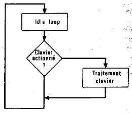 Deux méthodes peuvent cependant être employées par le microprocesseur pour savoir si un périphérique a besoin de lui. Première méthode : Intervention dans l'Idle Loop Quand il n'a « rien de spécial à faire », le microprocesseur exécute une série d'instructions qui servent à rafraîchir la RAM, ou à tester si un périphérique sollicite sa présence. Cette série d'instructions porte le nom d'« Idle Loop » ou boucle d'attente principale. Le test d'activation du clavier pourra être fait dans l'Idle Loop de la manière suivante :