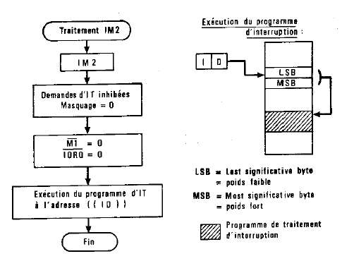 La routine d'interruption doit se terminer par l'instruction RET ou RETI.IM 2 : Interrupt Mode 2 Permet de valider le mode d'interruption 2. Ce mode est actif quand l'ordre IM 2 est rencontré. Si la demande d'IT est acceptée (IT validées par El et aucune interruption en cours) : - les demandes d'interruptions sont inhibées et l'état de masquage des interruptions est écrasé (IFF = 0),