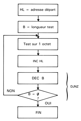 JP (HL) JP (IX) JP (IY)Les indicateurs ne sont pas modifiés.Dans la suite, DEPL représente un déplacement relatif signé sur 7 bits. Le bit 8 (bit de poids le plus fort) représente le signe. S'il est égal à un, le déplacement se fait vers le haut. S'il est égal à 0, le déplacement se fait vers le bas.JR DEPL Jump Relative : débranchement inconditionnel au déplacement indiqué. JR C, DEPL Jump Relative if Carry : saut relatif si le bit C des indicateurs est égal à 1. Si l'indicateur Carry est positionné (dernier résultat supérieur à 255 ou comparaison entre 2 nombres dont le 1er est strictement inférieur au second), le débranchement se produit. 1 ORG 9000H 2 LOAD 9000H 3 9000 3E12 LD A,12H 4 9002 0616 LD B,16H 5 9004 B8 CP B ;C positionne 6 9005 3800 JR C,ADR ;Saut effectue 7 Traitement si C = 0 8 ADR: EQU $ 9 ;Traitement siC = 1 10 ENDJR Z,DEPLJump Relative if Zéro : saut relatif si le bit Z des indicateurs est égal à 1. Si l'indicateur zéro est positionné (le dernier calcul a donné un résultat nul ou une comparaison a été faite entre deux nombres identiques), le débranchement se produit. 1 ORG 9000H 2 LOAD 9000H 3 9000 3E7A LD A, 122 4 9002 D67A SUB 122 ;Z positionne 5 9004 2800 JR Z,ADR ;Saut effectue 6 ;Traitement si non zéro 7 ADR: EQU $ 8 ;Traitement si zéro 9 ENDJR NC,DEPLJump Relative if Not Carry : saut relatif si le bit C des indicateurs est égal à 0. Si l'indicateur Carry n'est pas positionné (dernier résultat inférieur à 255 ou comparaison entre deux nombres dont le premier est supérieur ou égal au second), le débranchement se produit. 1 ORG 9000H 2 LOAD 9000H 3 9000 3E12 LD A,12H 4 9002 0E04 LD C,4 5 9004 B9 CP C ;C non positionne 6 9005 3000 JR NC,ADR ;Saut effectue 7 ;Traitement siC = 1 8 ADR: EQU $ 9 ;Traitement si C = 0 10 ENDJR NZ, DEPLJump Relative if Not Zéro : saut relatif si le bit Z des indicateurs vaut 0. Si l'indicateur Zéro n'est pas positionné (le dernier calcul a donné un résultat non nul ou une comparaison a été faite entre deux nombres différents), le débranchement se produit. 1 ORG 9000H 2 LOAD 9000H 3 9000 3E7A LD A, 122 4 9002 FE01 CP 1 ;Z non positionne 5 9004 C20790 JP NZ,ADR ;Saut effectue 6 ;Traitement si Zéro 7 ADR: EQU $ 8 ;Traitement si non Zéro 9 ENDDJNZ DEPLDecrement B and Jump if Not Zéro : Décrémente le registre B de 1 et saute à l'adresse relative indiquée si B< >0. Cette instruction est très pratique pour effectuer des calculs ou des tests répétitifs, comme le montre l'exemple suivant. Utilisation Supposons que nous voulions chercher l'occurence de l'octet 54H sur un espace mémoire commençant en 7000H et sur une longueur de 40 octets. Pour réaliser ce test, il sera commode d'utiliser l'ordre DJNZ de la façon suivante : 1 ORG 9000H 2 LOAD 9000H 3 9000 210070 LD HL,7000H ;@ départ 4 9003 0628 LD B,40 ;Lgr test 5 BOUCLE: EQU $ 6 9005 7E LD A,(HL) ;octet teste 7 9006 23 INC HL ;memoire suivante 8 9007 FE54 CP 54H ;54 hexa ? 9 9009 CA0E90 JP Z,TROUVE ;oui 10 900C 10F7 DJNZ BOUCLE ;non 11 TROUVE: EQU $ 12 ;A ce niveau, si Z = 0, HL = @ octet+1 13 ;si Z = 0, l'octet n'est pas trouve 14 END - Appel à un sous-programme : Débranchement du programme en forçant la valeur du PC (Program Coun-ter) à la valeur indiquée dans l'argument. L'adresse de retour du sous-programme est mise dans la pile, et le retour sera effectué sur la rencontre d'une instruction RET ou équivalent.