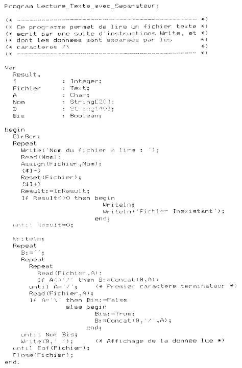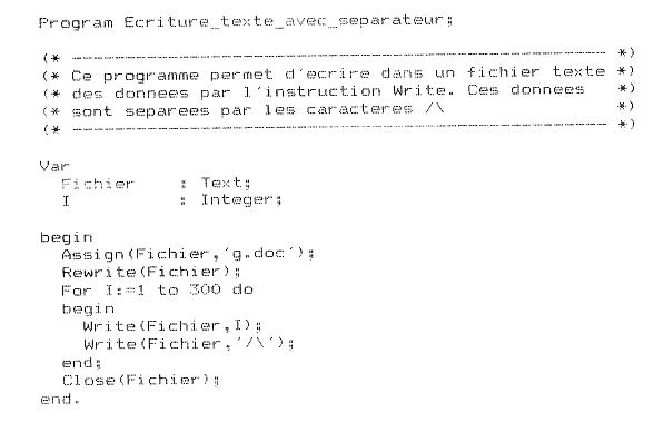 4/4.5 - Utilisation du Turbo-Pascal4/4.5.1 - Optimisation d'écriture dans un fichier texte Il existe essentiellement deux ordres en Turbo-Pascal pour écrire dans un fichier texte. Il s'agit de « Writeln » et de « Write ». (Voir Partie 4, chap. 4.) Le premier ordre sépare les données écrites par un < CR > < LF > (passage à la ligne). Pour des raisons de rapidité de lecture de fichiers texte, il est intéressant d'utiliser la seconde forme d'écriture. Mais alors se pose un problème lorsque l'on veut relire les données écrites. Effectivement, aucun séparateur n'existe entre deux données, et une lecture du type Read (fichier,variable) où variable est une chaîne, qui a toutes les chances de produire une erreur 10 (erreur dans la longueur d'une chaîne) car, une fois lue, cette dernière dépasse les 255 caractères. Une solution pour résoudre ce problème consiste à séparer chaque donnée écrite par un signe séparateur (qui ne fait pas partie des caractères que l'on peut trouver dans le fichier). La lecture d'un tel fichier se fait caractère par caractère avant de rencontrer le séparateur. Nous avons pris le séparateur « / », car il n'apparaît sûrement pas dans les données que vous ou tout autre informaticien manipule tous les jours. Vous pouvez bien sûr changer ce séparateur en effectuant des modifications mineures dans les listings. Ecriture dans un fichier texte en utilisant l'ordre Write Nous donnons comme exemple l'écriture des 300 premiers nombres entiers. Les données sont écrites dans le fichier « g.doc ».