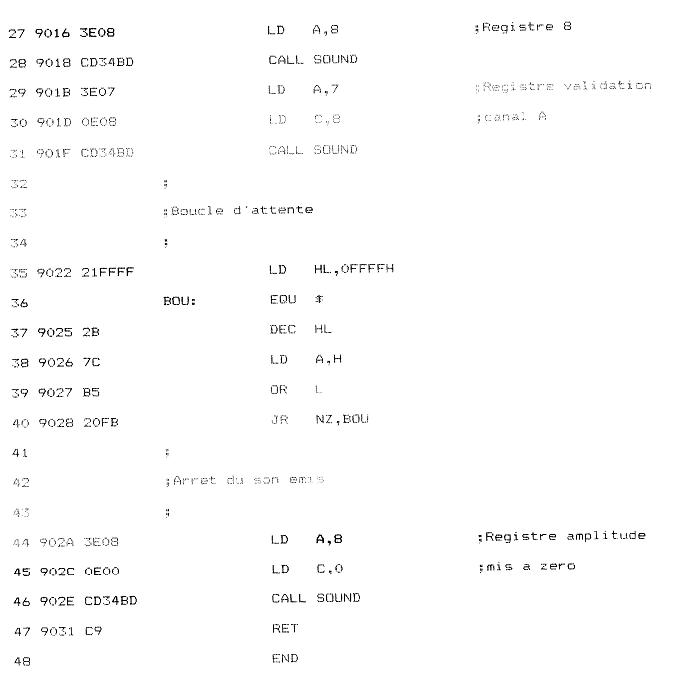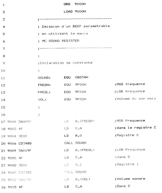 Emission d'un Beep de fréquence et intensité variables Le principe est le même, à ceci près que la fréquence doit être placée dans les variables FREQH et FREQL qui correspondent respectivement au poids fort et au poids faible de la fréquence à émettre. Il convient également de placer la valeur du volume dans la variable Vol juste avant l'appel. Un exemple est donné dans le programme suivant :