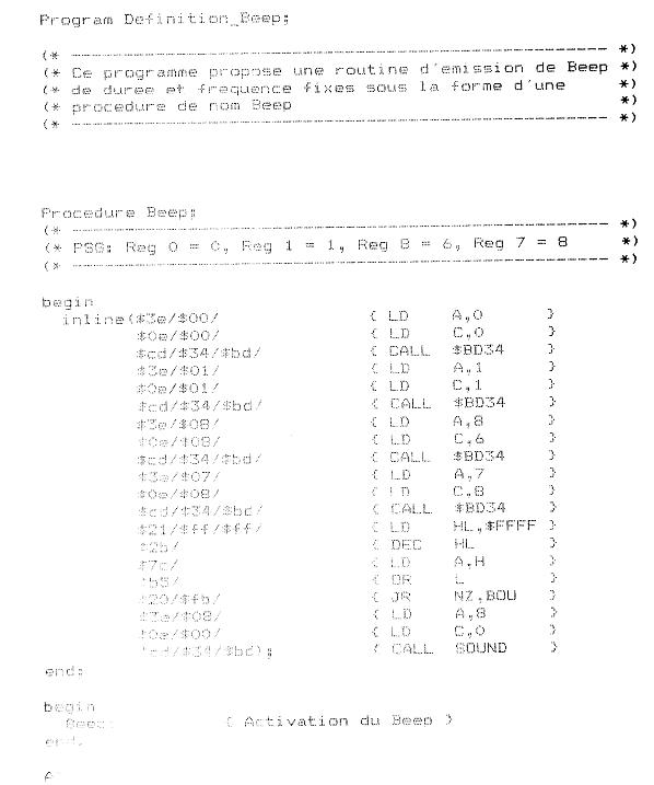 Le programme Pascal d'émission du Beep consiste à incorporer les données hexadécimales correspondant au programme Assembleur précédent dans une procédure. Remarquez que le code #C9 correspondant au RET de fin de routine n'a pas été reporté dans le programme Pascal. En effet, le « end; » de la procédure a le même effet.