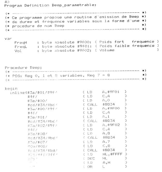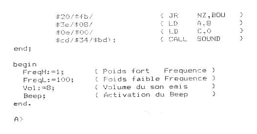4/4.5 - Utilisation du Turbo-Pascal4/4.5.2 Définition de routines sonores Contrairement au Turbo-Pascal implanté sur les IBM PC, la version Amstrad ne contient pas de procédure sonore. Nous allons pallier ce problème en réalisant : — une procédure d'émission de Beep fixe. Cette procédure servira par exemple à indiquer que l'utilisateur a fait une action incorrecte... — une procédure d'émission de Beep paramétrable. Les fréquence et puissance du son émis pourront être choisies à volonté par l'utilisateur. Emission d'un Beep de fréquence fixe Pour réaliser un tel programme, intégrons un court programme écrit en Assembleur dans le programme Pascal en utilisant l'ordre « InLine ». Structure du programme Assembleur Une macro instruction du Firmware des CPC permet de programmer directement les registres du PSG (AY3-8912). Il s'agit de l'instruction MC SOUND REGISTER dont le point d'entrée se trouve en #BD34. (Voir Partie 4, Chap. 2.7). Pour ce qui nous concerne, il suffit de savoir que : — le numéro du registre du PSG à accéder doit être placé dans le registre A avant l'appel ; Un appel à MC SOUND REGISTER se fera donc de la façon suivante : LD A,NR ; No registre à accéder Pour réaliser un Beep. nous utilisons les registres PSG suivants : — registres 0 et 1 pour définir la fréquence du Beep ; Le Beep est émis pendant une durée qui correspond au temps nécessaire pour faire oasser le registre HL de #FFFF à #0000 en opérant une décrémentation unitaire à chaque pas. Le Beep est arrêté en dévalidant le canal A grâce au registre 7 du PSG. Le programme Assembleur d'émission d'un Beep est donc le suivant :