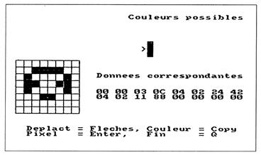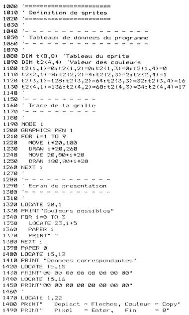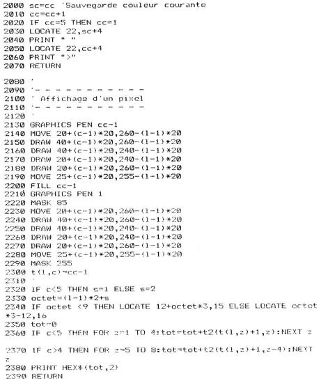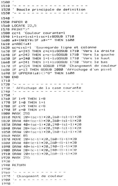 1470 LOCATE 1,22 1480 PRINT” Deplact = Fléchés, Couleur = Copy" 1490 PRINT" Pixel = Enter, Fin = Q"Le programme se poursuit par la boucle principale de définition dans laquelle les diverses touches pressées sur le clavier sont interprétées.Après diverses initialisations, le sous-programme situé en ligne 1710 est appelé. Ce sous-programme affiche la case courante dans la grille : 1590 l=1:c=1:sl=l:sc=1:GOSUB 1710La case courante affichée, le programme se met en attente d'une action au clavier :1600 a$=INKEY$:IF a$=M " THEN 1600Lorsqu'une touche est pressée, son code ASCII est stocké dans la variable a :1610 a=ASC(a$)Les ligne et colonne courantes sont sauvegardées dans les variables sc et si :1620 sc=c:sl=1'Sauvegarde ligne et colonneLorsque la touche pressée est une touche flèche, la variable I ou c est modifiée en conséquence :1630 IF a=243 THEN c=c+1:GOSUB 1710 'Vers la droite 1640 IF a=242 THEN c=c-1:GOSUB 1710 'Vers la gauche 1650 IF a=240 THEN 1=1-1:GOSUB 1710 'Vers le haut 1660 IF a=241 THEN 1=1+1:GOSUB 1710 'Vers le basLorsque la touche < Copy > est pressée, le sous-programme de changement de couleur est activé :1670 IF a=224 THEN GOSUB 1950 'Changement de la couleurLorsque la touche < Enter > est pressée, le sous-programme d'affichage d'un pixel est activé :1680 IF a=13 THEN GOSUB 2080 'Affichage d'un pixelEnfin, lorsque la touche “Q" est pressée, le programme prend fin. Dans tous les autres cas, la touche est ignorée et le programme se met en attente d'une autre action au clavier :1690 IF UPPER$(a$)<>''Q" THEN 1600Le listing se termine par les trois sous-programmes dont nous venons de parler :Les lignes 1710 à 1940 affichent la case courante dans la grille. Les paramètres nécessaires en entrée sont les nouvelles ligne (l) et colonne (c) de la case courante. Si ces données sont incorrectes (par exemple suite à l'appui sur la touche flèche vers la droite alors que le curseur se trouve dans la dernière colonne de la grille), elles sont révisées : 1760 IF l=9 THEN l=8 1770 IF l=0 THEN l=1 1780 IF c=9 THEN c=8 1790 IF c=0 THEN c=1La case courante est repérée dans la grille par une ligne discontinue. L'ancienne case courante (de coordonnées sc,sl) est affichée avec une ligne continue :1800 MASK 255 1810 MOVE 20+(sc-1 )*20,260-(sl-1 )*20 1820 DRAW 40+(sc-1)*20,260-(sl-1)*20 1830 DRAW 40+(sc-1)*20,240-(sl-1)*20 1840 DRAW 20+(sc-1 )*20,240-(sl-1 )*20 1850 DRAW 20+(sc-1 )*20,260-(sl-1 )*20et la nouvelle case courante est affichée avec une ligne discontinue :1800 MASK 85 1810 MOVE 20+(c-1)*20,260-(l-1)*20 1820 DRAW 40+(c-1 )*20,260-(l-1 )*20 1830 DRAW 40+(c-1 )*20,240-(l-1 )*20 1840 DRAW 20+(c-1 )*20,240-(l-1 )*20 1850 DRAW 20+(c-1 )*20,260-0-1 )*20Les lignes 1950 à 2070 permettent de changer la couleur courante.La couleur courante est sauvegardée puis incrémentée : 2000 sc=cc 'Sauvegarde couleur courante 2010 cc=cc+1Lorsque la nouvelle couleur est égale à 5 (le nombre de couleurs disponibles étant égal à 4), la variable cc est initialisée à 1 pour pointer sur la première couleur disponible :2020 IF cc=5 THEN cc=1Le signe ">" pointant sur l'ancienne couleur courante est effacé et le nouveau signe est affiché :2030 LOCATE 22,sc+4 2040 PRINT” " 2050 LOCATE 22,cc+4 2060 PRINT VLes lignes 2080 à 2390- affichent un point élémentaire dans la grille lorsque la touche < Enter > est pressée,- modifient et affichent les valeurs hexadécimales correspondantes.