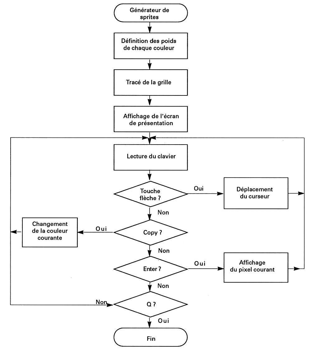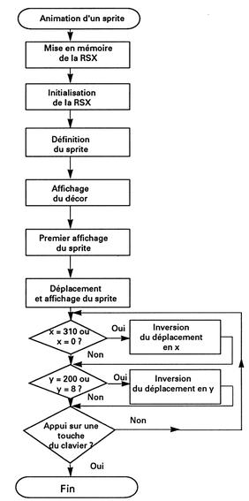 Comment utiliser la RSXLa RSX est bien entendu écrite en Assembleur. En voici le listing : ABS 9001 ADR 9005 ANCXY 9009 BUF 9029 BIS 9090 BISDEC1 90A3 BISDEC2 90BB BIS2 90F3 BISSAV1 9106 BISSAV2 911B BIS3 912D BISC0L1 9140 BISC0L2 9155 DOTPOS BC1D DEFRSX 9039 ESPRIT 9007 FININC 9096 FININC2 90F9 FININC3 9133 FIN 915E LOGEXT BCD1 NEXTLINE BC26 NUMERO 9000 ORD 9003 PREMAFF 8200 PTRTAB 902D SAUVDEC 8100 SPRITE 9043 SAUVEDE 90C1 TABLE 9032La version Assembleur est intéressante pour comprendre le fonctionnement des sprites, mais ce sont surtout les données hexadécimales correspondantes qui seront utilisées en programmation Basic.Pour utiliser cette RSX , procédez comme suit : - Définissez la RSX en exécutant le programme situé en &H9039 : CALL &H9039 - Avant d'afficher pour la première fois le sprite N (où N est compris entre 1 et 8) sur l'écran, initialisez la mémoire &H8200+N-1 à zéro par un POKE. Par exemple pour le sprite 1 : POKE &H8200,0 puis affichez le sprite en spécifiant les coordonnées d'affichage. Par exemple pour afficher le sprite 1 aux coordonnées x=100, y=50 : |SPRITE,1,100,50 - Lorsque le sprite N (où N est compris entre 1 et 8) a été affiché une fois, initialisez la mémoire &H8200+N-1 à un par un POKE. Par exemple pour le sprite 1 : POKE &H8200.0 puis affichez le sprite comme dans l'exemple ci-dessus. Le programme en détail La logique de la RSX apparaît dans l'ordinogramme suivant :