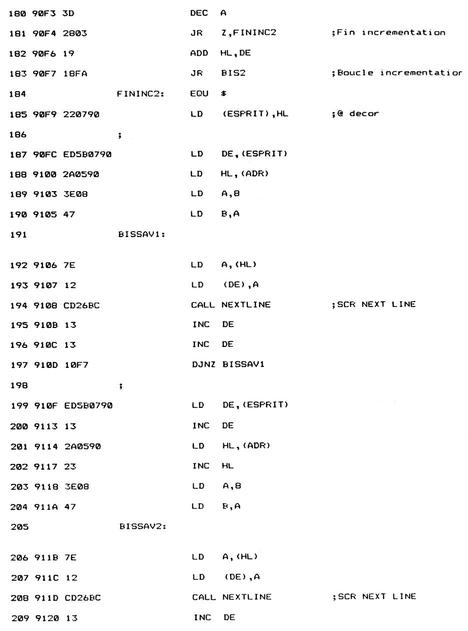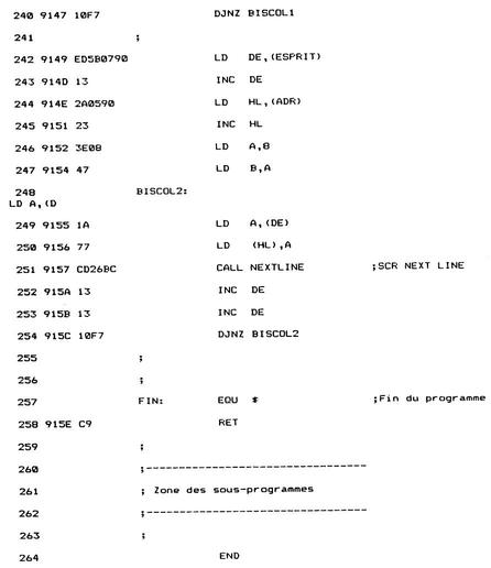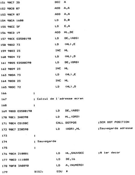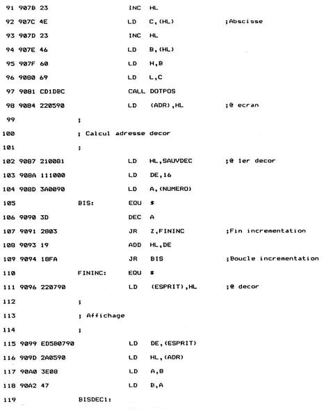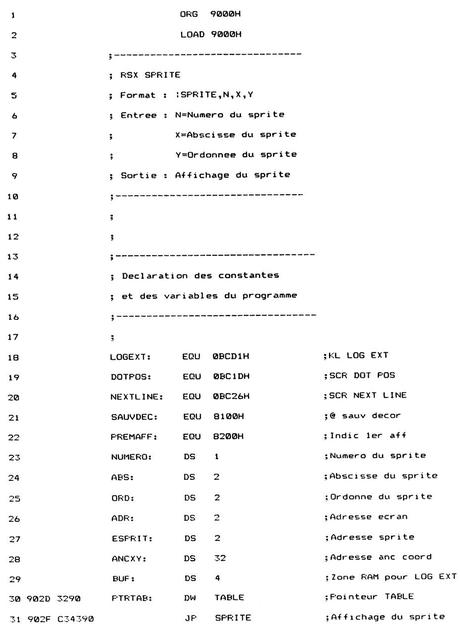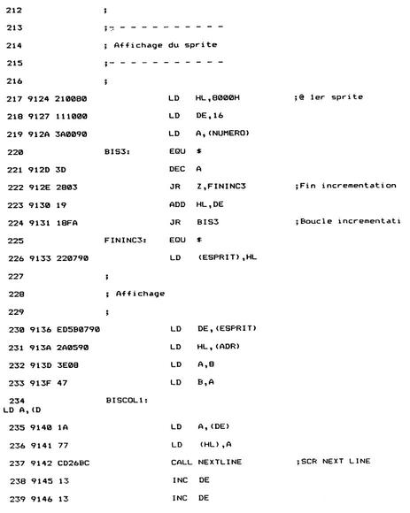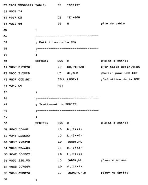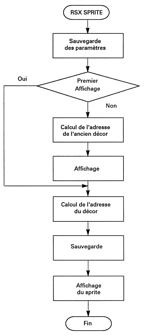 La RSX est définie à l'aide du petit programme situé entre les lignes 40 et 44 : DEFRSX: EQU $ ;Point d'entrée LD BC,PTRTAB ;Ptr table définition LD HL,BUF ;Buffer pour LOG EXT CALL LOGEXT ;Définition de la RSXLorsque le mot SPRITE sera reconnu par le Basic, le programme situé à l'étiquette SPRITE sera exécuté. En effet, le tableau PTRTAB pointe sur l'étiquette SPRITE et contient le mot clé SPRITE :PTRTAB: DW TABLE pointeur TABLE JP SPRITE ;Affichage du sprite TABLE: DB "SPRIT" DB "E"+80H DB 0 ;Fin de tableLe programme situé à l'étiquette SPRITE débute par la mémorisation des données qui lui sont passées :SPRITE: EQU $ ;Point d'entrée LD H, (IX+1) LD L, (IX+0) LD (ORD) ,HL LD H, (IX+3) LD L, (IX+2) LD (ABS) ,HL ;Sauv abscisse LD A, (IX+4) LD (NUMERO) ,ALa variable située en &H8200+NUMERO est ensuite examinée pour déterminer si le sprite est affiché pour la première fois :LD HL,PREMAFF LD A, (NUMERO) DEC A LD D,0 LD E,A ADD HL.DE LD A, (HL) ;lndic1eraff OR ALorsque le sprite est affiché pour la première fois, la phase d'affichage du décor est sautée :JP Z,SAUVDE ;Sauvegarde décorA partir du second affichage du sprite, le décor mémorisé à l'ancienne position du sprite est réaffiché. Les coordonnées de ce décor se trouvent dans la zone mémoire qui commence en ANCXY :- ordonnée en ANCXY + (NUMEROM — abscisse en ANCXY + (NUMEROM + 2 Ces coordonnées sont extraites de la mémoire et stockées dans les registres DE et HL : LD H L, ANCXY LD A,(NUMERO) DEC A ADD A,A ADD A,A → (NUMEROM LD D,0 LD E,A ADD HL,DE → ANCXY + (NUMEROM LD E, (HL) INC HL LD D, (HL) → DE = (ANCXY + (NUMEROM) INC HL LD C, (HL) INC HL LD B, (HL) → BC = (ANCXY + (NUMEROM + 2) LD H,B LD L,CLa routine SCR DOT POSITION du Firmware est ensuite appelée pour connaître l'adresse de l'octet qui correspond à ces coordonnées :CALL DOTPOSCette routine renvoie l'adresse recherchée dans le registre HL. Le programme stocke cette adresse dans la variable ADR :LD (ADR) ,HLL'adresse mémoire du décor est calculée par une simple addition : l'adresse du premier décor débute en SAUVDEC, et chaque décor occupe 16 octets. L'adresse qui nous intéresse est donc calculée de la manière suivante :adresse = SAUVDEC + (NUMERO)*16 Comme la multiplication ne fait pas partie des opérations de base du Z80, nous avons eu recours à une boucle pour calculer (NUMERO)*16 : LD HL,SAUVDEC ;Adresse du premier décor LD DE, 16 LD A, (NUMERO) BIS: EQU $ DEC A JR Z,FININC ;Fin de l'incrémentation ADD HL,DE JR BIS ; Boucle d'incrémentation FININC: EQU $ LD (ESPRIT) ,HL ;Adresse du décorL'affichage des 16 octets du décor se fait à l'aide de deux boucles. La première affiche les 8 octets correspondant à la partie gauche du décor :LD DE, (ESPRIT) LD HL, (ADR) LD A,8 LD B,A BISDEC1: LD A, (DE) octet lu en mémoire LD (HL) ,A affiché sur l'écran CALL NEXTLINE → passage à la ligne suivante sur l'écran INC DE —>... et en mémoire INC DE DJNZ BISDEC1 → boucle d'affichageRemarquez :- la macro NEXTLINE du Firmware qui permet de connaître l'adresse de l'octet qui représente les 4 points situés en-dessous des 4 points courants ; - l'utilisation pratique de l'instruction DJNZ qui exécute la boucle 8 fois, jusqu'à ce que le registre B soit nul. La seconde boucle affiche les 8 octets correspondant à la partie droite du décor. Elle utilise la même logique que la précédente. Nous n'y reviendrons pas. Le nouveau décor est sauvegardé selon le procédé inverse. Les données sont lues sur l'écran à partir des coordonnées ABS et ORD, et sauvegardées en mémoire (lignes 140 à 211). Nous n'y reviendrons pas. Le programme se termine par l'affichage du sprite aux coordonnées ABS,ORD. Cet affichage est très similaire à l'affichage du décor. Il occupe les lignes 212 à 254. Le programme se termine par une instruction RET qui redonne le contrôle au Basic. DÉMONSTRATION DE L'ANIMATION D'UN SPRITE Le court programme présenté dans ce paragraphe montre comment utiliser la RSX SPRITE dans un programme Basic. Son but est uniquement démonstratif. Aucune action n'est donc demandée à la personne qui l'utilise, si ce n'est l'appui sur une touche quelquonque du clavier qui met fin à son exécution. Son listing est le suivant : Le programme en détailLa logique du programme apparaît dans l'ordinogramme suivant :