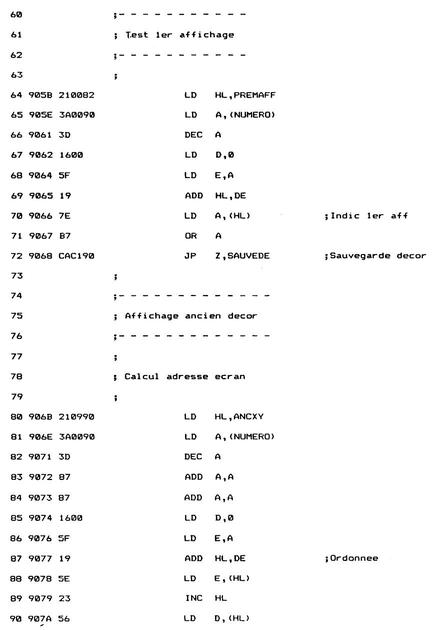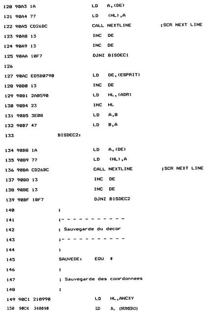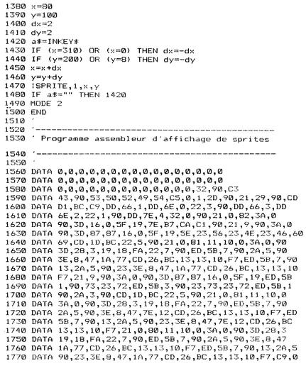 2130 GRAPHICS PEN cc-1 2140 MOVE 20+(sc-1)*20,260(sl-1)*20 2180 DRAW 20+(sc-1)*20,260-(sl-1)*20 2190 FILL cc-1 2200 GRAPHICS PEN 1 2220 MASK 85 2230 MOVE 20+(sc-1)*20,260-(sl-1)*20 2280 DRAW 20+(sc-1)*20,260-(sl-1)*20 2290 MASK 255La couleur de la case affichée est mémorisée dans le tableau t :2300 t(1,c)=cc-1Le curseur est positionnné sur la donnée hexadécimale à modifier :2320 IF c2330 octet=(l-1)*2+s 2340 IF octet La nouvelle valeur hexadécimale est calculée à partir des tableaux t et t2 :2350 tot=0 2360 IF c2370 IF c>4 THEN FOR z=5 TO 8:tot=tot+t2(y(l,z)+1,z-4):NEXT zet affichée sur deux digits :2380 PRINT HEX$(tot,2)La rsx d'affichage |SPRITEComment afficher un objet sur l'écran et le déplacer sans effacer le décor ? Eh bien tout simplement en mémorisant le décor qui se trouve sous le sprite et en le réaffichant lors du prochain déplacement. Ce raisonnement simpliste est la base de la RSX |SPRITE. Lors du premier affichage du sprite sur l'écran, aucun décor n'a encore été mémorisé. Il est donc inutile d'afficher la zone de mémoire correspondant au décor. Par contre, il faut sauvegarder le décor qui se trouve sous le sprite avant de l'afficher. Lors des futurs déplacements de sprite, il faudra : - restituer le décor sauvegardé ;