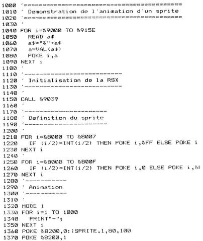 1320 LOCATE 20,1 1330 PRINT "Couleurs possibles" 1340 FOR i=0 TO 3 1350 LOCATE 23,i+5 1360 PAPER i 1370 PRINT" " 1380 NEXT i- les données hexadécimales correspondant au sprite sont initiali-sées à 0 et affichées à l'aide d'instructions PRINT :