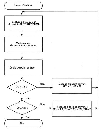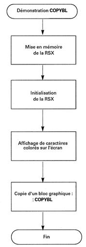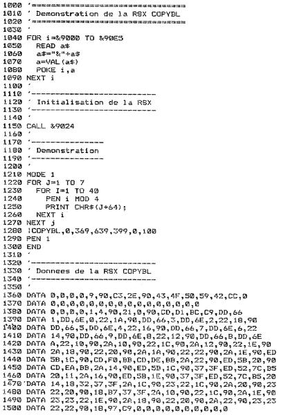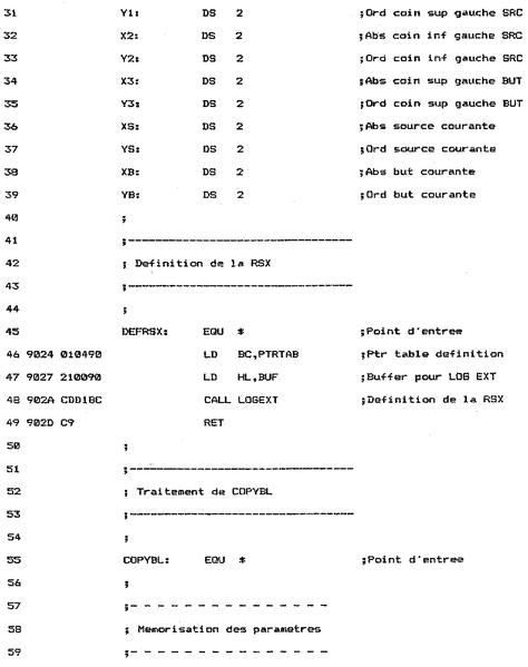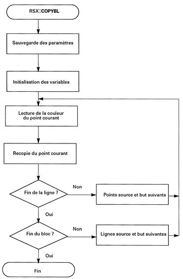 à la position spécifiée : coordonnées X3, Y3.Comment utiliser la RSX Le listing de la RSX est le suivant : BUF 9000 BOUCLE 907C COPYBL 902E DEFRSX 9024 FIN 90E5 LOGEXT BCD1 LXGSUIV 90C5 PLOTABS BBEA PTRTAB 9004 PTSUIV 90B3 SETFEN BBDE TESTABS BBF0 TABLE 9009 X1 9010 X2 9014 X3 9018 XS 901C XB 9020 Y1 9012 Y2 9016 Y3 901A YS 901E YB 9022Sa version Assembleur est intéressante pour comprendre son fonctionnement, mais son utilisation réelle se fera sous la forme de données hexadécimales insérées dans un programme Basic.Pour utiliser la RSX, il faut l'installer à l'aide d'une instruction CALL : CALL &9024puis l'appeler en spécifiant les coordonnées extrémales du rectangle à copier (XI, Y1 et X2, Y2) et le coin inférieur gauche à partir duquel doit être affiché la copie (X3, Y3) :|COPYBL, x1, y1, x2, y2, x3, y3La RSX en détailLa logique de la RSX apparaît dans l'ordinogramme suivant :