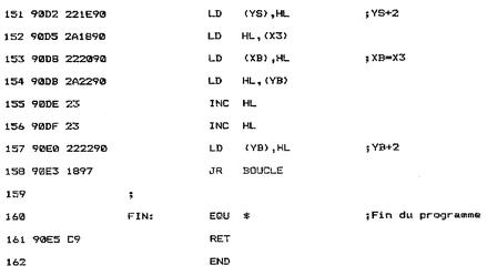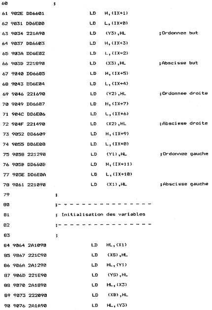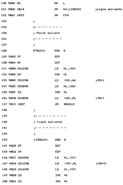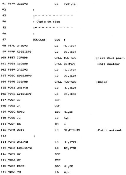 La couleur du point situé en XS, YS est lue à l'aide de la macro TESTABS: BOUCLE : EQU $ LD HL, (YS) LD DE, (XS) CALL TESTABS ; Test coul pointCette couleur devra être reproduite dans le bloc but. Aussi est-elle passée à la macro SETPEN qui initialise la couleur de tracé :CALL SETPEN ;lnit couleurLe point de coordonnées XB, YB est allumé avec la même couleur que le point source :LD HL, (YB) LD DE, (XB) CALL PLOTABS ;CopieL'abscisse source est alors comparée à l'extrémité droite du bloc source, dans le but de déterminer si une des lignes du bloc source a été décrite. L'indicateur de retenue est préalablement mis à zéro pour éviter toute erreur dans la soustraction 16 bits entre HL et DE :LD HL, (X2) LD DE, (XS) SCF CCF SBC HL, DE LD A, H OR LLorsque toute la ligne n'a pas été décrite, le programme donne le contrôle à l'étiquette PTSUIV qui donne accès aux points source et but suivants :JR NZ, PTSUIV ;Point suivantDans le cas où toute la ligne a été décrite, le programme teste si tout le bloc source a été décrit en comparant les ordonnées Y2 et YS :LD HL, (Y2) LD DE, (YS) SCF CCF SBC HL, DE LD A, H OR LLorsque tout le bloc source n'a pas été décrit, le programme donne le contrôle à l'étiquette LIGSUIV qui donne accès au premier point de la ligne suivante dans les blocs source et but :JR NZ, LIGSUIV ;Ligne suivanteDans le cas où tout le bloc source a été décrit, le programme redonne le contrôle au Basic :JR FIN FIN: EQU $ RETLe programme se termine par les deux routines qui permettent de passer au point suivant et à la ligne suivante dans les blocs source et but.Le passage au point suivant se fait par la simple incrémentation de variables XS et XB : PTSUIV: EQU $ SCF CCF LD HL, (XS) INC HL LD (XS), HL ;XS+1 LD HL, (XB) INC HL LD (XB), HLLe passage à la ligne suivante est plus complexe :- l'abscisse source est initialisée à X1 (XS=X1) ;