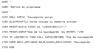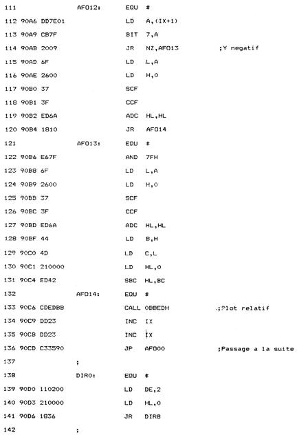 Entrez le nom de l'écran à compacter. Cet écran aura été créé par le programme de tracé défini au chapitre 10.1 de la partie 5. Déplacez ensuite le curseur graphique (grâce aux touches-flèches) jusqu'à rencontrer un point allumé sur le dessin. Appuyez sur la touche « ENTER ». Le programme trace alors d'une autre couleur (PEN 2) le contour de la forme jusqu'à aboutir à une discontinuité. Arrivé à ce point, le tracé s'arrête. Il faut alors déplacer le curseur pour « sauter » la discontinuité. Dès que le curseur se trouve sur un autre point (voisin) du dessin, appuyez sur la touche « ENTER », et ainsi de suite jusqu'à ce que tout l'objet ait changé de couleur. Appuyez alors deux fois sur la touche « ESC ». Le programme indique la place occupée par le fichier compacté et propose une sauvegarde magnétique ou un retour au compactage (appui sur « ENTER »). Le programme de compactage est le suivant :
