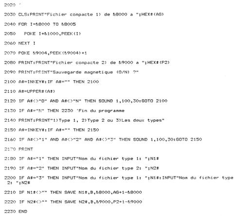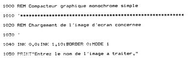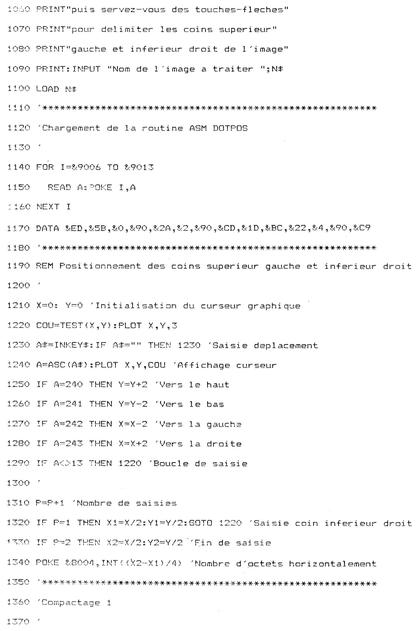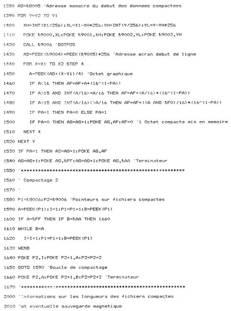 gauche et inférieur droit de la portion d'image à compacter en vous servant des touches-flèches (la validation des deux coins se fait par la touche « ENTER »). Un certain temps, proportionnel aux dimensions du dessin à compacter et à la lenteur du BASIC (!) est nécessaire pour le calcul des fichiers compactés. Le programme affiche alors la place occupée par le compactage de type 1 et 2. Le programme de compactage des types 1 et 2 est le suivant :