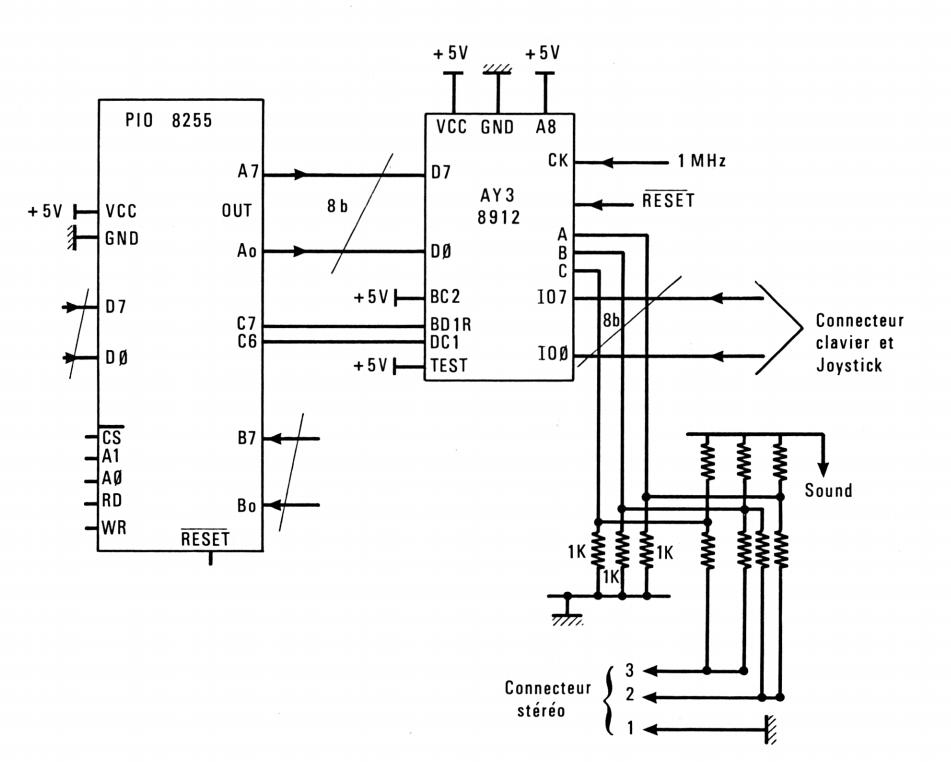 Le générateur d'enveloppe agit sur le contrôleur d'amplitude pour contrôler la variation d'amplitude d'un son dans le temps, sur les trois canaux. 6°) Convertisseur digital analogique Un par voie ; ils permettent de convertir les signaux numériques issus des générateurs sonores en un signal analogique qui sera envoyé sur un haut parleur. 7°) Port d'entrée/sortie Permet de sélectionner un des 16 registres internes du AY3 par l'intermédiaire de deux signaux : BDIR et BC1. Si BDIR = 0 et BC1 =0 AY3 est inactif. Si BDIR = 0 et BC1 = 1 AY3 est en mode lecture. Si BDIR= 1 et BC1 =0 AY3 est en mode écriture. Si BDIR= 1 et BC1 = 1 AY3 charge l'adresse d'un de ses registres internes. 8°) Buffers d'entrée/sortie Contiennent les données à écrire ou lues sur AY3. AY3 s'implante sur la carte mère de la façon suivante : Nous voyons que :