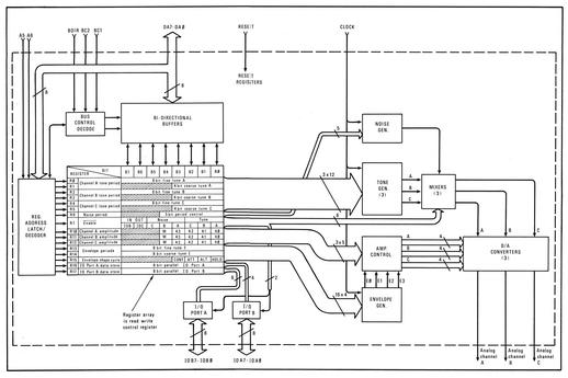 6/2 Introduction au circuit sonore AY3-8912Le circuit AY3-8912 de General Instruments est souvent utilisé sur les micro-ordinateurs familiaux. La raison en est simple : ce générateur sonore allie facilité de programmation et diversité des sons générés. Il est entièrement programmable au moyen de 16 registres internes dont la description sera faite ci-après. Une fois ses registres programmés, AY3 n'a plus besoin du micro-processeur pour générer un son, même si celui-ci dure plusieurs secondes. Ceci est un atout supplémentaire non négligeable, car la programmation des registres internes est ultra rapide, et le micro-processeur disposera de beaucoup de temps pour s'occuper d'autres choses, ce qui est important dans les jeux d'arcades par exemple. STRUCTURE INTERNE AY3-8912 peut gérer trois voies sonores simultanément et une voie de bruit blanc. Le schéma interne ci-dessous nous montre que ce circuit est divisé en huit parties : 1°) Générateurs sonores Au nombre de trois, un pour chaque canal. Ils produisent des signaux carrés de fréquence programmable par les registres internes. 2°) Générateur de bruit blanc Il produit des signaux rectangulaires de fréquence variable et quelconque. Le bruit obtenu est un souffle plus ou moins aigu. 3°) Mélangeur de canaux Permet de mixer le bruit blanc et les trois canaux sonores. 4°) Contrôleur d'amplitude Fournit au convertisseur digital analogique (CDA) le volume sonore de la sortie analogique. Ce volume peut être fixé ou contrôlé par le générateur d'enveloppe. 5°) Générateur d'enveloppe On appelle enveloppe la forme qui « entoure » un son dans le temps.