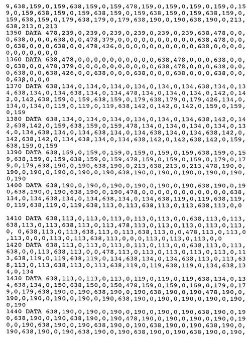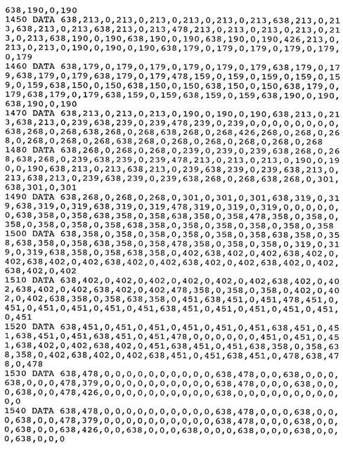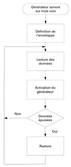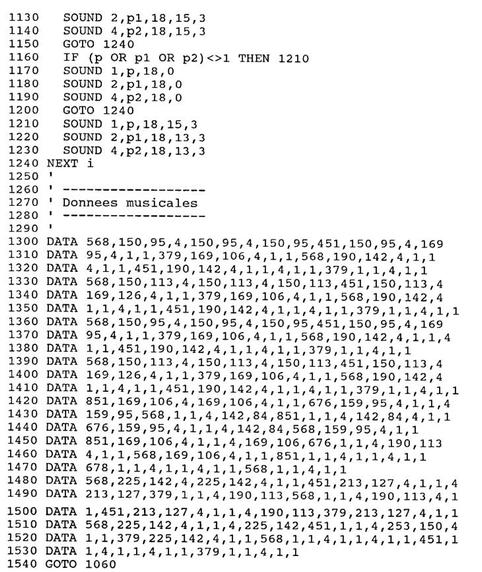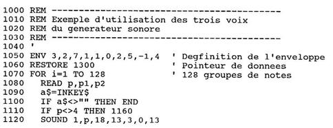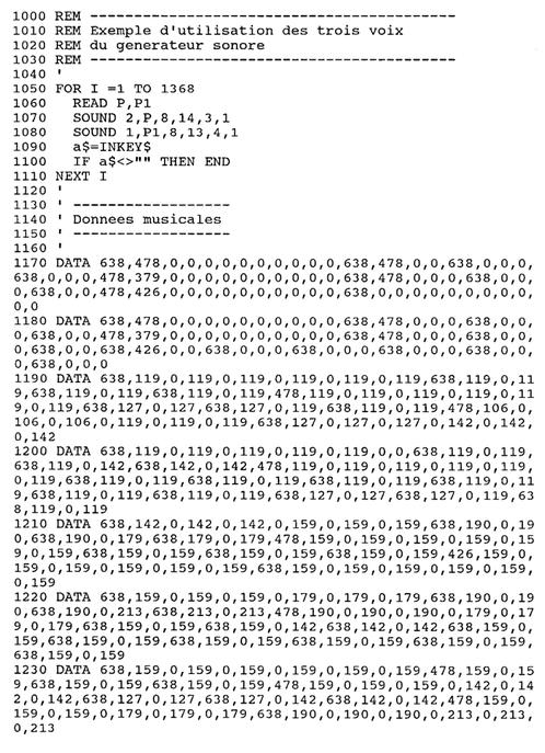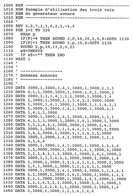 L'enveloppe est définie à l'aide d'une instruction ENV : 1050 ENV 3,2,7,1,1,0,2,5,-1,4 Les données sont réinitialisées ligne 1300 à l'aide d'une instruction RESTORE : 1060 RESTORE 1300 Les instructions suivantes lisent les données musicales qui se trouvent lignes 1300 à 1540 et les passent générateur sonore. Le premier morceau étant composé de 128 notes, la boucle FOR de lecture se fait entre 1 et 128 : 1070 FOR i=1 TO 128 1240 NEXT i Les données sont stockées sous la forme de triplets : Voix1, Voix2, Voix3 Une instruction READ les stocke dans les variables p, p1 et p2 : 1080 READ p,p1,p2 Le programme teste alors si le clavier a été activé. Si oui, il met fin au programme : 1090 a$=inkey$ 1100 IF a$ < > "" THEN END Dans le cas contraire, les trois données musicales lues sont envoyées au générateur sonore à l'aide d'instructions SOUND. L'émission des sons dépend de la valeur de la première donnée. Cette méthode permet de définir un rythme à moindres frais : 1110 IF p < > 4 THEN 1160 1230 SOUND 4,p2,18,13,3 Les instructions suivantes définissent les données des trois voix (lignes 1300 à 1530). La ligne 1540 redonne le contrôle à la ligne 1060, ce qui fait « boucler » le programme.