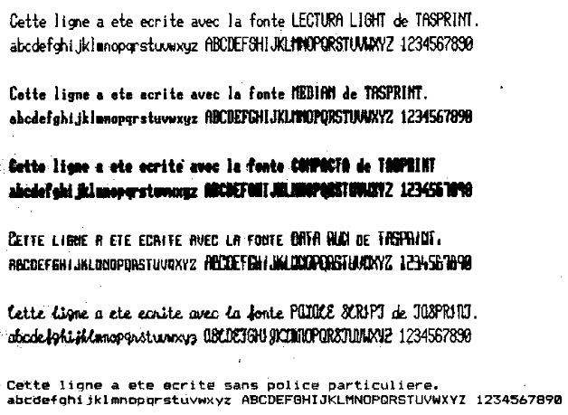 L'option « 1 » du menu principâl, accessible par [CTRL] [RETURN] permet d'installer simultanément les cinq polices proposées par Tasprint. On peut donc utiliser plusieurs polices différentes à l'intérieur d'un même texte, mais une seule police par ligne. Cette règle est également valable pour la police de caractères normale qui ne peut pas cohabiter avec une police Tasprint sur la même ligne.