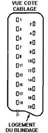 8/2 - Module péritel pour téléviseur couleurCe dispositif est installé sur tous les téléviseurs couleurs commercialisés en France depuis 1981. Il permet d'utiliser un téléviseur couleur comme un moniteur. La plupart des micro-ordinateurs possèdent les signaux de synchronisation nécessaires au pilotage de la prise péritel. L'AMSTRAD fait partie de ceux-là. De plus, la qualité obtenue sur le téléviseur en utilisant la prisa péritel est supérieure à celle que l'on aurait en utilisant un modulateur UHF. Nous voyons donc qu'il peut être intéressant de connecter l'AMSTRAD sur votre téléviseur couleur, surtout si vous possédez un CPC avec écran monochrome. La prise PERITEL implantée sur le téléviseur comporte 21 broches implantées de la façon suivante : Le pas entre deux contacts est de 3.81 mm et la distance entre les deux rangées de 5.08 mm. Les signaux qui arrivent ou partent de chaque broche sont les suivants :