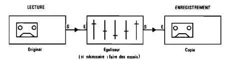 En vitesse rapide, tout est doublé : 2 000 bauds et des fréquences d'environ 1 000 à 2 000 Hz, exactement comme si l'on « passait la bande » à vitesse double. Encouragé par ce premier succès, nous avons tenté de quadrupler la vitesse en faisant tourner la bande mère â 38 cm/s : là c'est un peu juste, mais faisable. Paradoxalement, la qualité est souvent meilleure en accéléré qu'à vitesse normale : 1 000 et 2 000 Hz sont des fréquences plus proches de la meilleure zone de fonctionnement des magnétophones que 500 et 1 000 Hz. L'important est de travailler avec du matériel de bonne qualité et si possible monophonique. Transiter par un magnétophone à bobines est l'idéal, mais on peut aussi accoupler deux bonnes platines à cassette : il faudra alors dans certains cas intercaler un « égaliseur » (ou « equalizer ») afin que les deux fréquences soient reproduites exactement au même niveau (contrôle au VU-mètre ou mieux à l'oscilloscope).