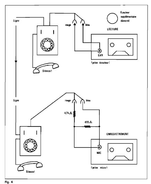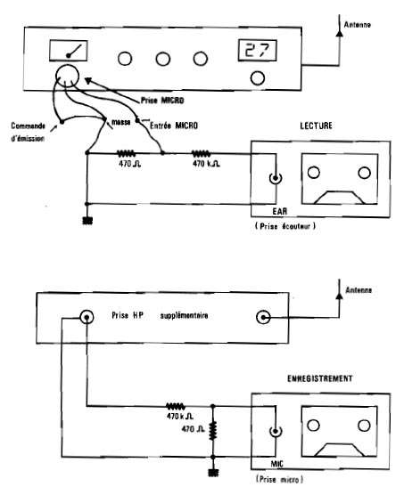 La figure 3 donne un exemple d'installation permettant, avec un minimum de soins, la transmission de programmes à l'aide d'émetteurs-récepteurs « CB » : en fait, de simples atténuateurs à résistances suffisent pour adapter les niveaux de signal rencontrés sur les « radios » et sur les magnétophones 1 A la figure 4, nous découvrons un procédé rustique mais utile permettant de transmettre des programmes par téléphone. Bien évidemment, la qualité de la liaison devra être bonne, ce qui est plus ou moins fréquent (ou rare !) selon les régions. Le principe de l'opération consiste à démonter l'écouteur supplémentaire de chacun des postes téiéphoniques ordinaires utilisés, ce qui libère deux fils à chaque bout de la ligne. Il importe de régler le niveau de lecture du magnétophone transmetteur pour que le son perçu dans le combiné ne soit ni plus fort, ni plus faible que pour une conversation normale. Du point de vue de la réception, il faudra régler avec soin le niveau d'enregistrement, sauf s'il est automatique. Précisons bien que toutes ces idées, même si elles ont été soigneusement vérifiées « sur le terrain », ne sont pas à considérer comme des recettes « clés en main » : les conditions locales sont trop variables, tant en radio qu'en téléphonie. Elles doivent être donc considérées comme des axes de recherche qu'il faut adapter à votre cas personnel. C'est précisément le plus passionnant...