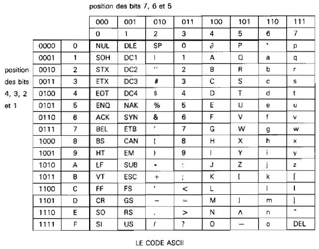 8/5.2.2 - Le code ASCIIPour permettre la communication en différents organes informatiques, des codes concernant les caractères se sont multipliés. Le code ASCII ( American Standart Code for International Interchange) est actuellement le plus répandu et admis par presque toutes les sociétés. C'est un code à sept bits, le plus souvent utilisé avec un bit supplémentaire (bit de parité) permettant de détecter d'éventuelles erreurs.