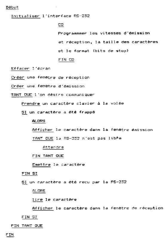Discussion par clavier interposé : si vous possédez deux Amstrad, ou avez un ami proche de chez vous, vous pouvez, grâce à l'interface RS-232C, discuter avec lui par l'intermédiaire de vos claviers et écrans sur une distance pouvant aller jusque cinquante mètres sans trop de problème, à condition d'utiliser du câble blindé. Si vous n'avez que quelques mètres à faire parcourir à votre discussion, un câble classique suffira. Nous vous présentons tout d'abord l'algorithme du programme afin de se familiariser avec la programmation structurée.