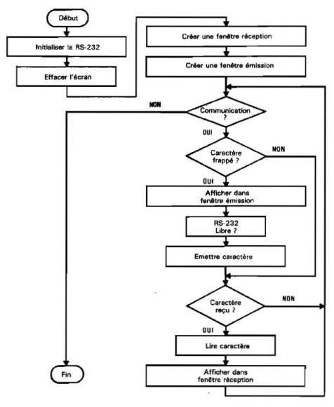 * Programme Chacun des deux interlocuteurs lancera le programme. Deux fenêtres seront alors créées : – la fenêtre EMISSION qui affichera les caractères frappés au clavier. Ces caractères – la fenêtre RECEPTION qui affichera les caractères reçus par la RS-232, donc émis par le deuxième interlocuteur.