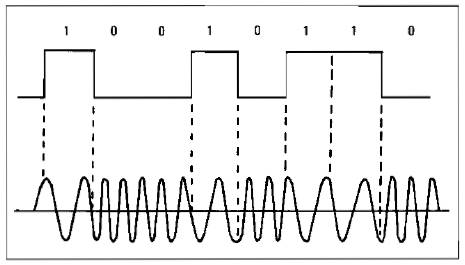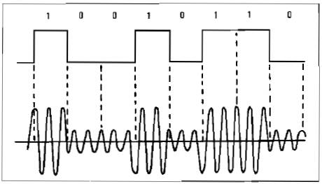 Deux techniques de modulation d'amplitude (AM) peuvent être employées : l'ASK {Amplitude Shift Keying) et la BLU [Bande Latérale Unique). La modulation de fréquence C'est le principe de codage le plus utilisé actuellement pour les modems car peu sensible aux parasites, et de fabrication économique. Dans ce type de modulation, l'amplitude du signal émis reste fixe, c'est la fréquence du signal qui varie selon l'état du bit à transmettre. Deux fréquences différentes seront utilisées. Dans le cas du minitel, en réception à 1 200 bauds, la fréquence du « 1 » logique est 1 300 Hz, celle du «0» est 2 100 Hz.