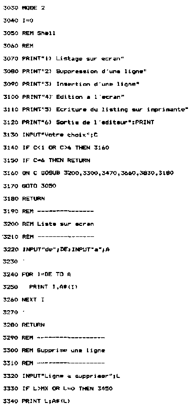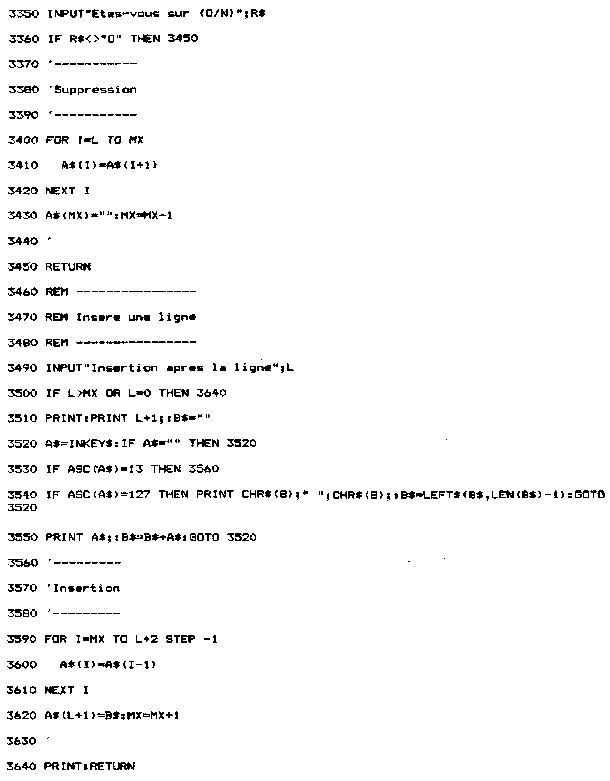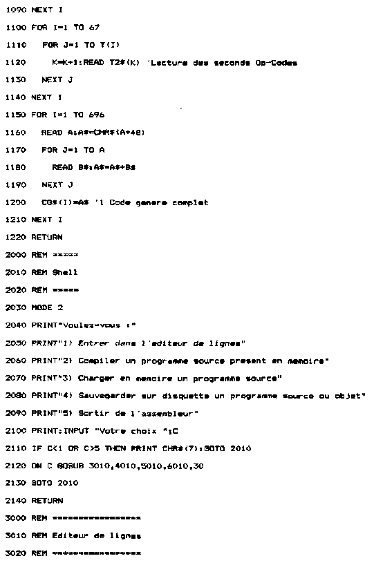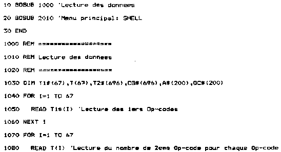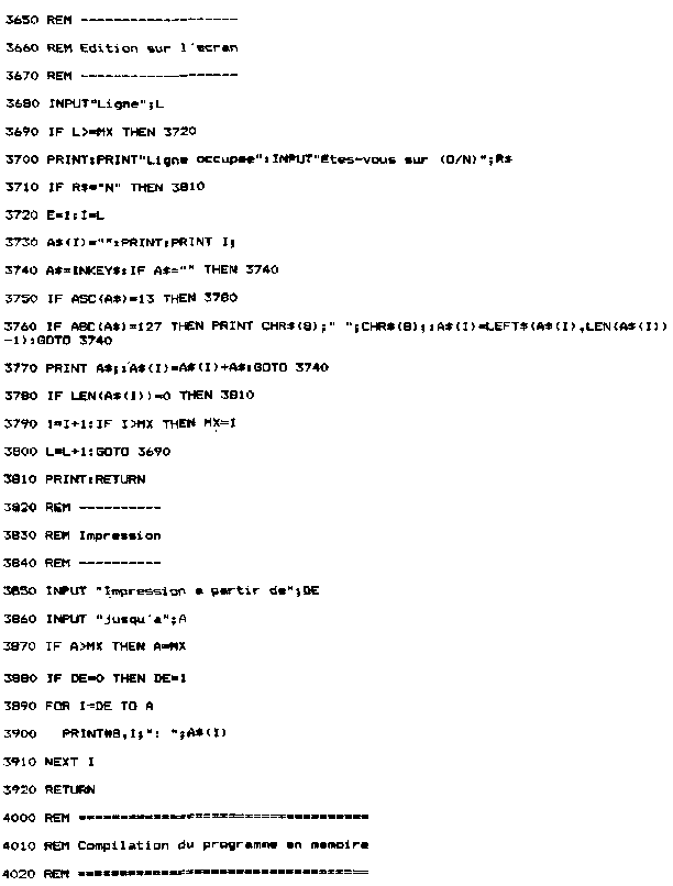 Si la ligne sur laquelle vous voulez écrire n'est pas vierge, le message « Ligne occupée » apparaîtra à l'écran. Si vous répondez 0, la ligne qui portait le même numéro que la ligne courante sera remplacée par la ligne courante. 2°) Affichage sur l'écran du texte saisi Vous pourrez lister sur l'écran une ou plusieurs lignes, en donnant les numéros de première et dernière ligne à lister. de – entrez le premier numéro de ligne, 3°) Impression du texte entré sur une imprimante Cette option est comparable à la précédente, à ceci près que le texte sera imprimé et non pas affiché sur l'écran. Il vous faut donner les premier et dernier numéro de ligne à lister en répondant aux questions suivantes : Impression a partir de – entrez le premier numéro de ligne 4°) Suppression d'une ligne de texte La ligne à supprimer est repérée par son numéro de ligne. Vous devez indiquer ce numéro après le message : Ligne a supprimer – entrez le numéro de ligne à supprimer La ligne concernée est alors affichée à l'écran, précédée de son numéro de ligne. La question « Etes-vous sur (O/N) » vous permet d'éviter de supprimer une ligne par erreur : Si vous avez sélectionné une mauvaise ligne, répondez N, et la ligne ne sera pas effacée. 5°) Insertion d'une ligne de texte Une ligne peut être insérée n'importe où entre le premier numéro de ligne et le dernier numéro de ligne. Sélectionnez l'option correspondante dans le menu (option 3), puis donnez te numéro de la ligne après laquelle il faudra insérer la ligne que vous allez saisir. Pour cela, répondez à la question suivante : Insertion après la ligne – en donnant le numéro de la ligne après lequel doit se faire l'insertion Le programme de saisie de texte est inséré dans un programme complet d'édition/compilation/sauvegarde, Il est accessible à partir d'un menu général (souvent appelé SHELL dans la littérature informatique), et occupe les lignes 3000 à 3920 dans le listing général : Lignes 3000 à 3180 : Menu de l'éditeur de lignes, imprimante. II. Compilateur A. DEFINITION Un abus de langage est souvent fait par les informaticiens pressés. Pour eux, le terme « Assembleur » désigne aussi bien :