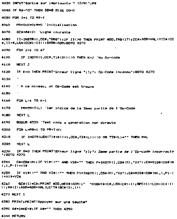 La détection du code « ORG » est faite ligne 4080. La détection d'un des Op-code du 280 est faite entre les lignes 4090 et 4140. « Erreur ligne XXXX : Op-code inconnu » * 2e opération Le premier Op-code identifié, il faut voir si l'association 1er Op-code/2e Op-code est correcte. Pour cela, nous calculons le déplacement à effectuer dans la liste des 2e Op-codes pour se situer sur le premier couple (1er Op-code/2e Op-code) validé. Ce calcul est fait entre les lignes 4160 et 4180. Certains 2e Op-codes contiennent une valeur numérique qui sera incorporée dans le code généré. Ces codes sont identifiés dans un sous-programme qui est appelé en ligne 4190. Le sous-programme d'identification consiste à extraire la ou les donnée(s) numéhque(s) présent(es) dans le 2e Op-code et à la (les) stocker dans une (des) variable(s). * 3e opération Enfin, le code est généré entre les lignes 4200 et 4260. Il est affiché sur l'écran ou envoyé vers l'imprimante en ligne 4260. Pour repasser au menu général, appuyez sur une touche (ligne 4280). III. Entrées / Sorties sur disquette Pour clore ce programme de compilation, deux sous-programmes ont été développés :