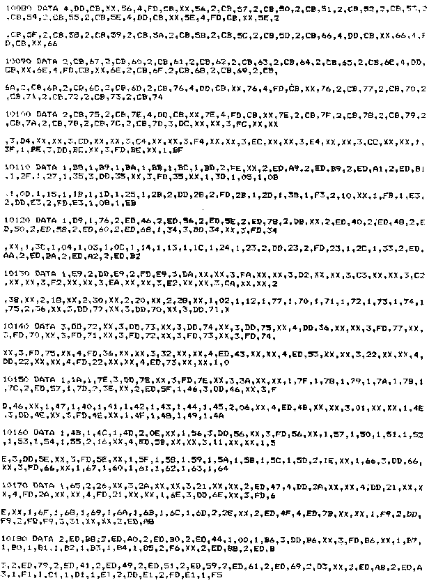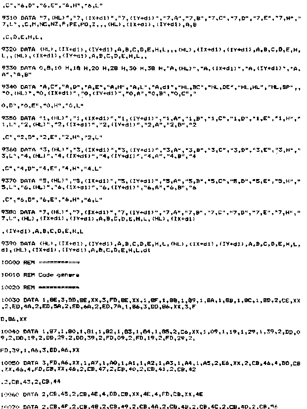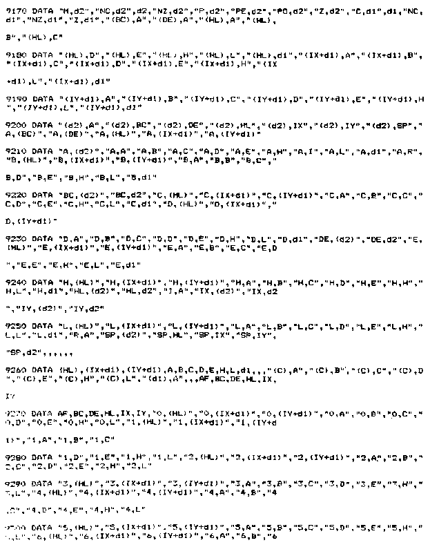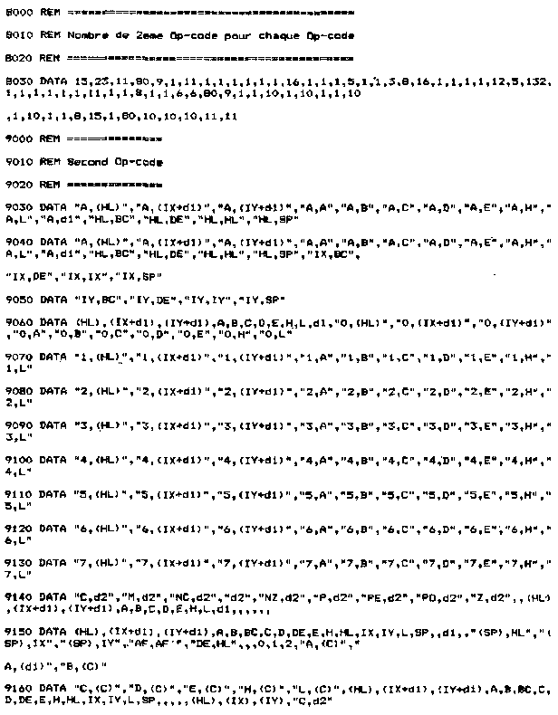 Assembleur : Compilateur qui transforme les codes opératoires en langage exécutable par te microprocesseur. Langage d'assemblage : Langage composé de codes opératoires. Ce langage a été créé pour faciliter la programmation (il est, en effet, plus facile de manipuler des mots-clés que des nombres, même s'ils sont exprimés en hexadécimal !). Avant de détailler le fonctionnement de l'Assembleur que nous allons développer, il convient de rappeler quelques notions fondamentales à propos des compilateurs. B. RAPPELS Comme nous l'ayons vu au Chapitre 2.1, un compilateur est un programme qui permet de transformer les mots-clés d'un langage en codes exécutables par le microprocesseur, donc en binaire. Le microprocesseur utilisé dans les CPC est un Z80 qui manipule des données de 8 bits. Pour plus de commodité, nous dirons que le travail du compilateur consistera à traduire des mots-clés en données hexadécimales codées sur 8 bits. Nous venons de soulever un des problèmes majeurs qui apparaît lorsque l'on s'attaque à l'écriture d'un compilateur, à savoir l'analyse des phrases entrées. Cette recherche de mots-clés dans les phrases entrées est souvent appelée analyse syntaxique. ANALYSE DES FONCTIONS D'UN COMPILATEUR DE LANGAGE D'ASSEMBLAGE Cette analyse va être faite de ta manière suivante. Nous allons considérer que le compilateur est une boîte noire dans laquelle arrivent des informations (entrées), de laquelle sortent des informations (sorties). Nous allons étudier successivement : 1 ) Les entrées, 1 - ENTREES Si nous analysons le langage d'assemblage, nous voyons qu'un mot-clé se décompose en deux parties : – une instruction (par exemple, ADD, LD, XOR, etc.), L'instruction permet de définir le type d'opération qui va être faite. Alors que l'opérande définit te ou les registres, l'adresse de la ou des mémoires qui vont participer à cette opération. L'analyse syntaxique portera donc sur deux entités : – l'instruction que nous appellerons « 1er Op-code » par la suite, A chaque 1er Op-code peut correspondre 1 ou plusieurs 2e Op-code. Par exemple, pour le 1er Op-code (SP),HL pour former les instructions complètes : EX (SP),HL Par contre, le 1er Op-code CPD ne possède qu'un deuxième Op-code de longueur nulle : En effet, l'instruction CPD se suffit à elle-même, et il n'est pas nécessaire d'indiquer sur quel(s) registre(s) ont porté les manipulations. Dans ce cas, on parle d'adressage implicite (Voir Chapitre 2.2 Partie 4, Les modes d'adressage). Il apparaît donc le besoin de donner le nombre de 2e Op-code pour chaque 1" Op-code. C'est (a démarche qui a été employée pour définir les entités manipulées par le compilateur. Sur le listing BASIC, vous pourrez remarquer le codage de ces trois types de données : Lignes 7000 à 7040 : Premier Op-code. Les données manipulées par le compilateur sont maintenant définies. Reste à décrire l'ensemble des codes qui pourront être générés par le compilateur. 2 - SORTIES A chaque couple (1er Op-code, 2" Op-code) correspond (ent) un ou plusieurs codes à générer. Ayant défini l'ensemble des 2B Op-code pour chaque 19r Op-code, il suffit d'associer le(s) code(s) à générer à chaque 2* Op-code pour passer en revue tous les codes possibles. Les codes générés occupent les lignes 10000 à 10320 du listing général. Ils sont définis de la manière suivante : – un premier nombre donne le nombre de code(s) généré(s), Remarque : Un « XX » dans un code généré indique que ce code sera contenu de manière implicite dans la phrase à compiler, et sera remplacé à la compilation. 3 - TRAITEMENTS Les entrées ( 1er Op-code, 2e Op-code) et les sorties (Codes générés) sont maintenant définis. Il reste à décrire le traitement à appliquer aux entrées pour les transformer en les sorties désirées. * 1er opération Il est nécessaire d'identifier le 1W Op-code dans chaque phrase. Ce 1Br Op-code pourra être :
