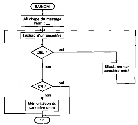 Les fonctions que nous venons d'énumérer sont accessibles par un menu affiché en début de programme et après chaque commande. Une fonction est activée en tapant la lettre du menu correspondante (par exemple L pour Lecture, X pour exécution, etc.). Passez en mode CAPS LOCK pour que le debugger fonctionne correctement. Si vous tapez une option que le debugger ne comprend pas, le menu est réaffiché et aucune autre action n'est effectuée.Les fonctions du debugger sont développées dans le programme assembleur qui suit. Nous allons les examiner en détail. I. Lecture d'un programme objet Les actions réalisées par cette option sont les suivantes : – saisie du nom du programme à lire : Pour cela, nous avons créé une routine de lecture (SAINOM) qui permet de lire une chaîne alphanumérique quelconque de longueur maximum 12 caractères qui se termine par le caractère CR (Carnage Return). La chaîne est stockée dans un buffer de lecture (BUFF). La routine de lecture suit la logique suivante :