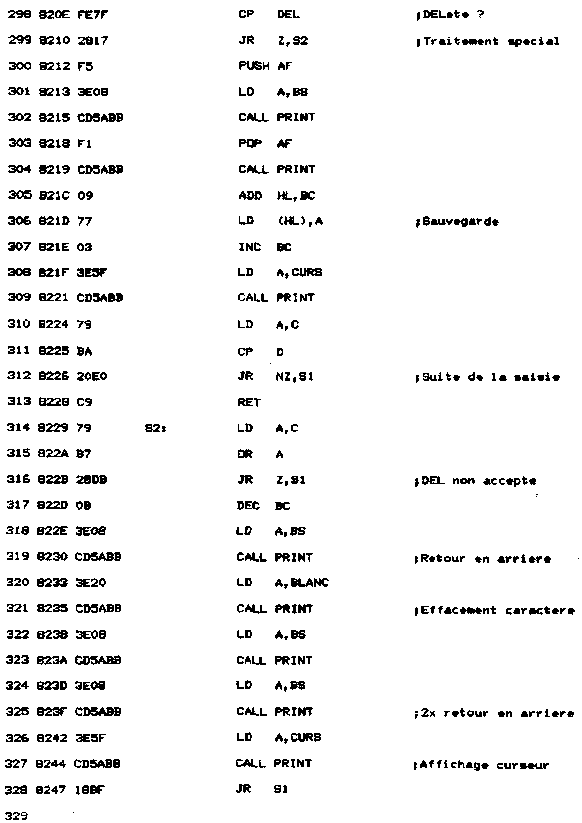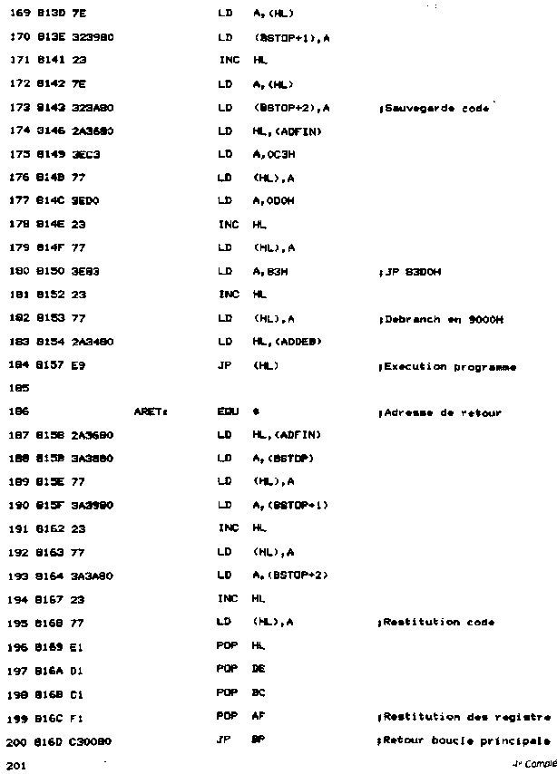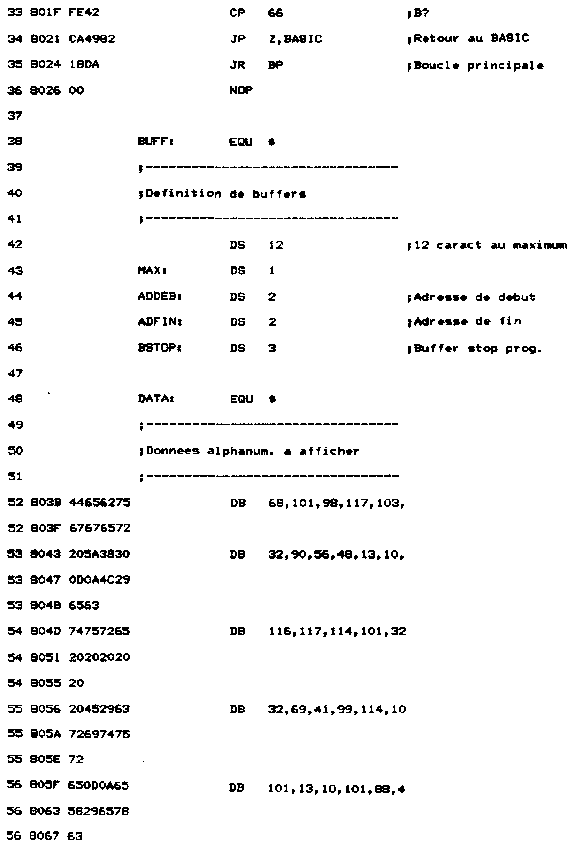 VI. Retour au BASICLe programme debugger étant activé sous BASIC, il suffit d'une instruction RET pour y retourner. C'est ce que réalise l'option B du menu. Deux méthodes sont possibles : - Saisie en assembleur ;