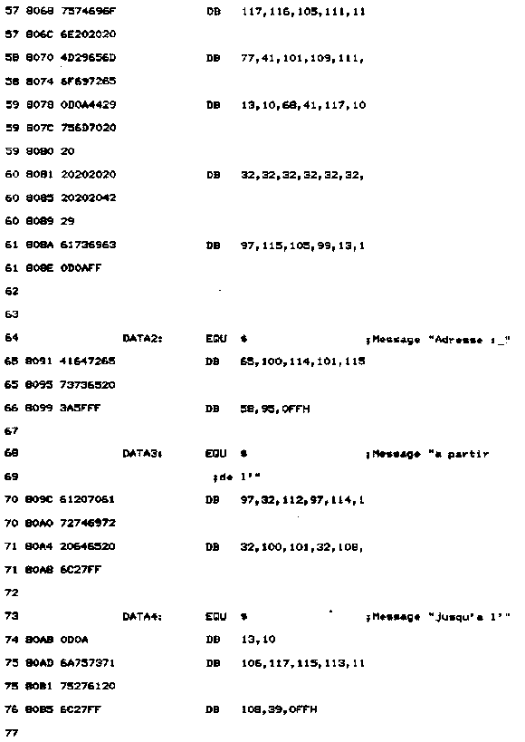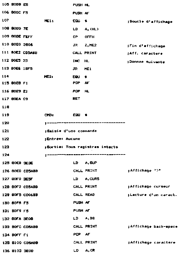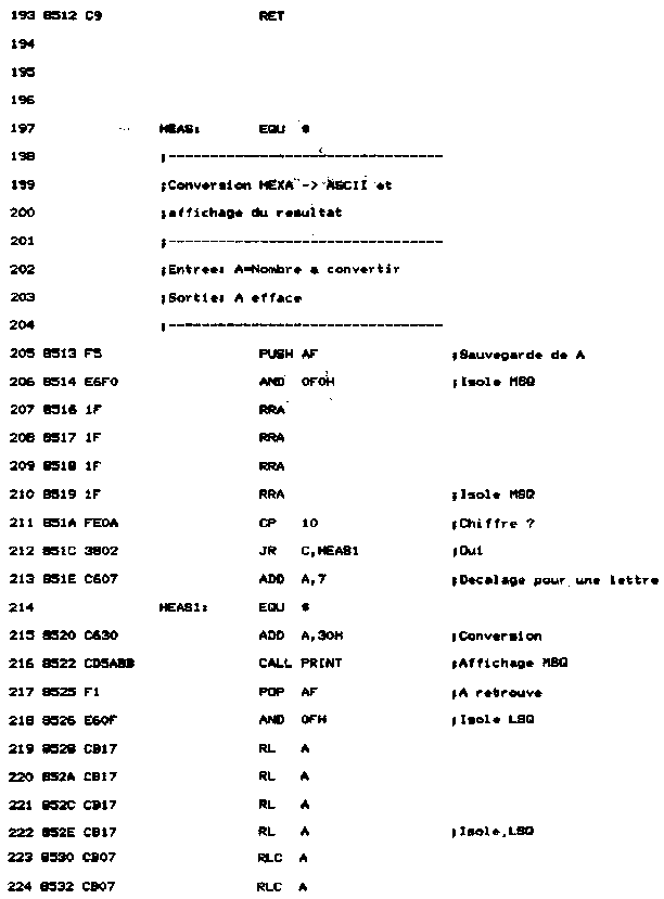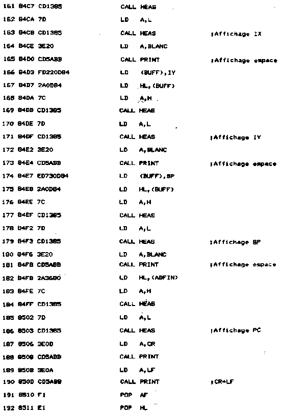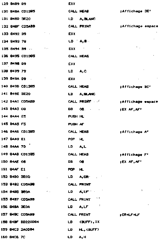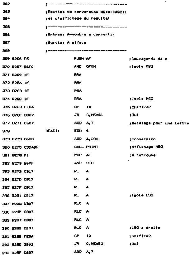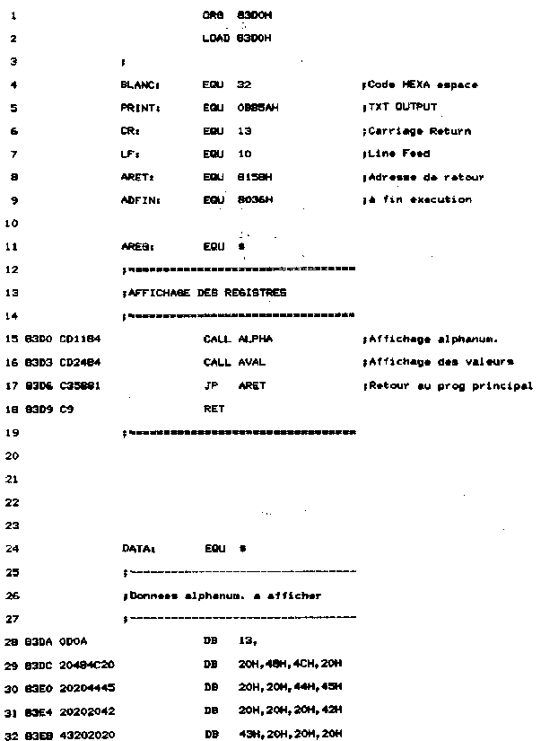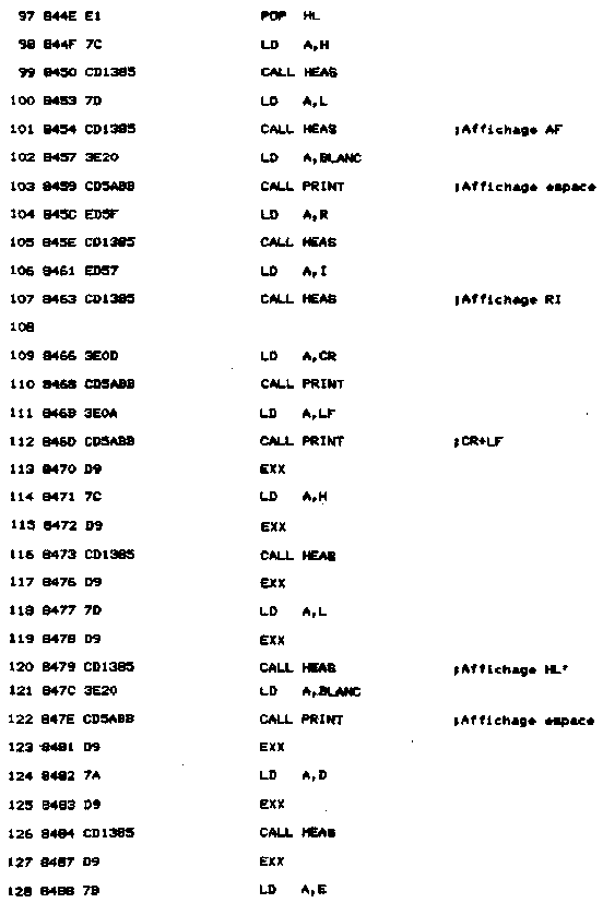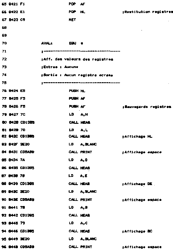 - Une routine de nom AVAL affiche le contenu des registres. Pour cela, une routine d'affichage spécifique a été développée. Elle a pour nom HEAS. Le quartet supérieur est séparé du quartet inférieur, converti en ASCII, et affiché par une routine Firmware.