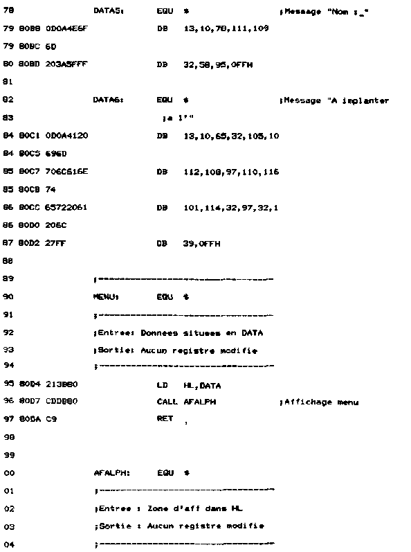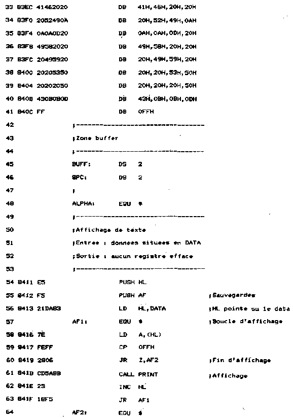 - Une routine de nom ALPHA affiche toutes les constantes texte (nom des registres) sur l'écran ;