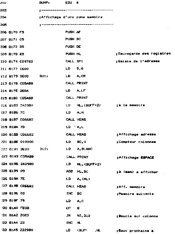 V. Affichage d'une zone mémoire : fonction DUMP- Les registres AF, BC, DE et HL sont sauvegardés en début de routine ;