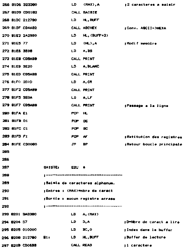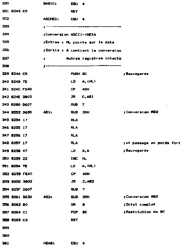 - La routine ASCHEX convertit (ASCII->HEXA) les caractères ASCII entrés au clavier acquis dans la routine SAISIE. Le code HEXA résultant de la conversion est alors stocké dans la mémoire sélectionnée ;