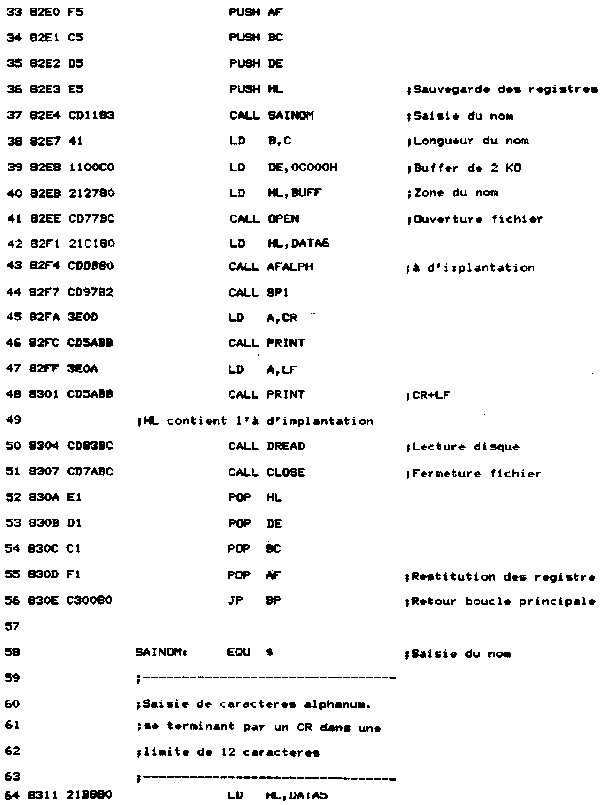 – ouverture du fichier : L'ouverture du fichier se fait en utilisant la macro du Firmware qui se trouve à l'adresse #BC77 et qui a pour nom CAS IN OPEN. A noter que cette macro est utilisable sur les trois CPC 464, 664 et 6128). – lecture de l'adresse d'implantation : Cette lecture est précédée de l'affichage du message "A implanter à l'adresse : __ ". La lecture de l'adresse d'implantation est faite en utilisant une autre routine que SAINOM pour rendre automatique le retour chariot en fin de saisie. En effet, le nombre de caractères saisis est invariablement quatre. Le code ASCII de chaque caractère est stocké séquentiellement dans la zone BUFF. La logique de la routine SP1 créée à cet effet est la suivante :