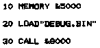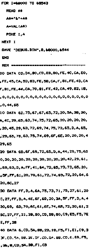 2e méthode Si vous préférez saisir le programme debugger sous BASIC, il vous faudra procéder en deux étapes : 1 ) Saisie d'un programme qui contient les codes HEXA du programme debugger et, qui fabrique le programme binaire DEBUG.BIN (Cf. programme page suivante). 2) Activation du debugger par le même programme BASIC que celui décrit page suivante.