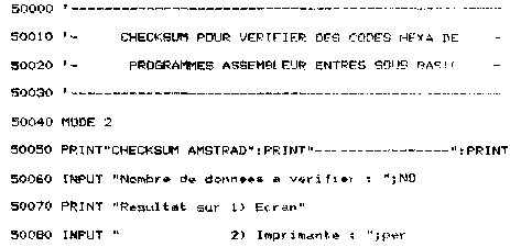 9/8.4 Checksum, vérificateur de donnéesNous vous donnons ici le listing d'un petit programme (dit de cheksum) qui vous permettra d'être sûr que les programmes assembleurs sont conformes à ceux présentés dans votre ouvrage « Comment exploiter toutes les ressources et augmenter les performances de votre Amstrad ». Précisons d'abord que est utilitaire ne concerne que les programmes assembleur qui sont incorporés dans des programmes Basic sous forme de DATA. Mais qu'est-ce qu'un checksum ? Encore un mot anglais pour désigner une opération assez étonnante de dépistage des erreurs. De nombreuses formes de checksum existent. Pour celui qui nous concerne, la valeur de vérification est obtenue en additionnant modulo 255 les données du programme 16 par 16. Une valeur de vérification existe donc pour 16 codes entrés. Pour vérifier la validité d'un programme qui contient un grand nombre de données numériques, utilisez ce programme et vérifiez que (es données de checksum sont correctes. Le listing de cet utilitaire bien précieux est le suivant. N'hésitez pas à le taper : il est court et il peut vous éviter bien des erreurs, et ... bien des courriers si vous êtes friand d'Assembleur !