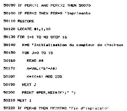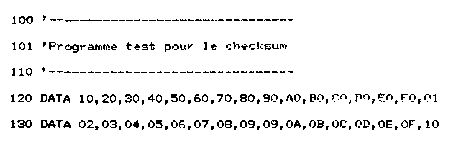 Entrez le programme ci-dessus. Supposons que vous ayez appelé le programme de checksum « CHECK » ; tapez « MERGE CHECK », puis « RUN 50 000 ». Vous verrez alors apparaître les données suivantes si vous avez bien tapé le listing test:
